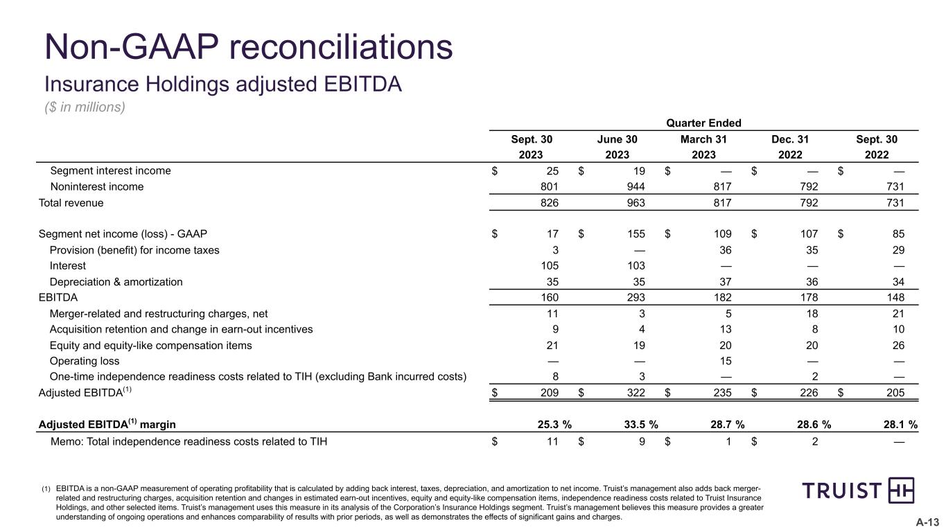 A-13 Non-GAAP reconciliations Insurance Holdings adjusted EBITDA ($ in millions) (1) EBITDA is a non-GAAP measurement of operating profitability that is calculated by adding back interest, taxes, depreciation, and amortization to net income. Truist’s management also adds back merger- related and restructuring charges, acquisition retention and changes in estimated earn-out incentives, equity and equity-like compensation items, independence readiness costs related to Truist Insurance Holdings, and other selected items. Truist’s management uses this measure in its analysis of the Corporation’s Insurance Holdings segment. Truist’s management believes this measure provides a greater understanding of ongoing operations and enhances comparability of results with prior periods, as well as demonstrates the effects of significant gains and charges. Quarter Ended Sept. 30 June 30 March 31 Dec. 31 Sept. 30 2023 2023 2023 2022 2022 Segment interest income $ 25 $ 19 $ — $ — $ — Noninterest income 801 944 817 792 731 Total revenue 826 963 817 792 731 Segment net income (loss) - GAAP $ 17 $ 155 $ 109 $ 107 $ 85 Provision (benefit) for income taxes 3 — 36 35 29 Interest 105 103 — — — Depreciation & amortization 35 35 37 36 34 EBITDA 160 293 182 178 148 Merger-related and restructuring charges, net 11 3 5 18 21 Acquisition retention and change in earn-out incentives 9 4 13 8 10 Equity and equity-like compensation items 21 19 20 20 26 Operating loss — — 15 — — One-time independence readiness costs related to TIH (excluding Bank incurred costs) 8 3 — 2 — Adjusted EBITDA(1) $ 209 $ 322 $ 235 $ 226 $ 205 Adjusted EBITDA(1) margin 25.3 % 33.5 % 28.7 % 28.6 % 28.1 % Memo: Total independence readiness costs related to TIH $ 11 $ 9 $ 1 $ 2 —