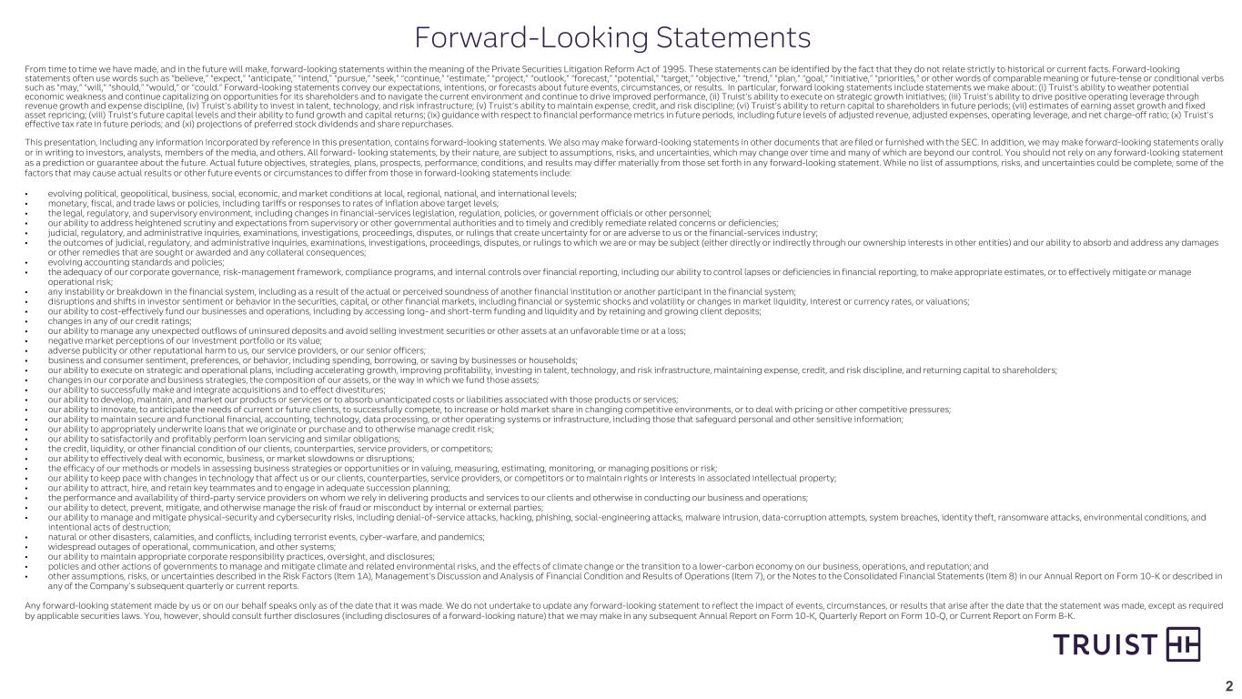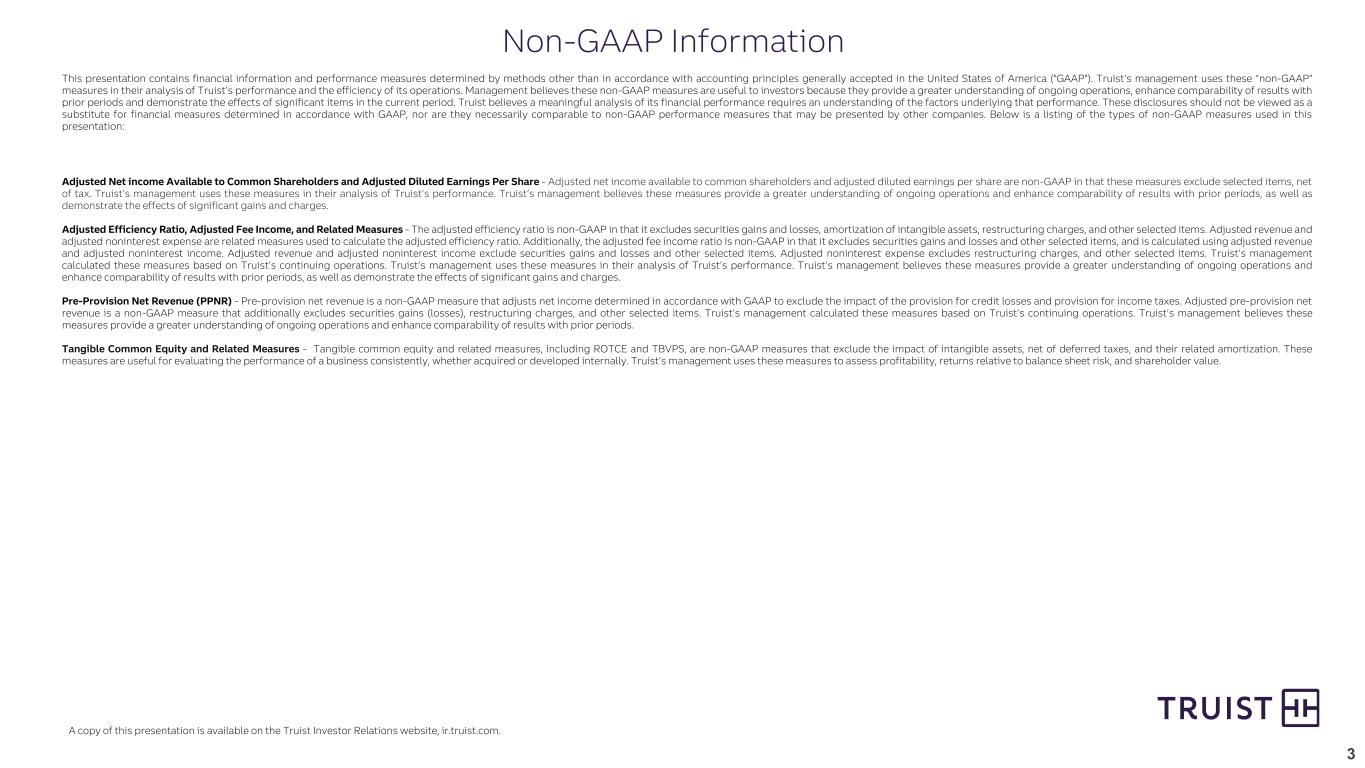 2 From time to time we have made, and in the future will make, forward-looking statements within the meaning of the Private Securities Litigation Reform Act of 1995. These statements can be identified by the fact that they do not relate strictly to historical or current facts. Forward-looking statements often use words such as “believe,” “expect,” “anticipate,” “intend,” “pursue,” “seek,” “continue,” “estimate,” “project,” “outlook,” “forecast,” “potential,” “target,” “objective,” “trend,” “plan,” “goal,” “initiative,” “priorities,” or other words of comparable meaning or future-tense or conditional verbs such as “may,” “will,” “should,” “would,” or “could.” Forward-looking statements convey our expectations, intentions, or forecasts about future events, circumstances, or results. In particular, forward looking statements include statements we make about: (i) Truist’s ability to weather potential economic weakness and continue capitalizing on opportunities for its shareholders and to navigate the current environment and continue to drive improved performance, (ii) Truist’s ability to execute on strategic growth initiatives; (iii) Truist’s ability to drive positive operating leverage through revenue growth and expense discipline, (iv) Truist’s ability to invest in talent, technology, and risk infrastructure; (v) Truist’s ability to maintain expense, credit, and risk discipline; (vi) Truist’s ability to return capital to shareholders in future periods; (vii) estimates of earning asset growth and fixed asset repricing; (viii) Truist’s future capital levels and their ability to fund growth and capital returns; (ix) guidance with respect to financial performance metrics in future periods, including future levels of adjusted revenue, adjusted expenses, operating leverage, and net charge-off ratio; (x) Truist’s effective tax rate in future periods; and (xi) projections of preferred stock dividends and share repurchases. This presentation, including any information incorporated by reference in this presentation, contains forward-looking statements. We also may make forward-looking statements in other documents that are filed or furnished with the SEC. In addition, we may make forward-looking statements orally or in writing to investors, analysts, members of the media, and others. All forward- looking statements, by their nature, are subject to assumptions, risks, and uncertainties, which may change over time and many of which are beyond our control. You should not rely on any forward-looking statement as a prediction or guarantee about the future. Actual future objectives, strategies, plans, prospects, performance, conditions, and results may differ materially from those set forth in any forward-looking statement. While no list of assumptions, risks, and uncertainties could be complete, some of the factors that may cause actual results or other future events or circumstances to differ from those in forward-looking statements include: • evolving political, geopolitical, business, social, economic, and market conditions at local, regional, national, and international levels; • monetary, fiscal, and trade laws or policies, including tariffs or responses to rates of inflation above target levels; • the legal, regulatory, and supervisory environment, including changes in financial-services legislation, regulation, policies, or government officials or other personnel; • our ability to address heightened scrutiny and expectations from supervisory or other governmental authorities and to timely and credibly remediate related concerns or deficiencies; • judicial, regulatory, and administrative inquiries, examinations, investigations, proceedings, disputes, or rulings that create uncertainty for or are adverse to us or the financial-services industry; • the outcomes of judicial, regulatory, and administrative inquiries, examinations, investigations, proceedings, disputes, or rulings to which we are or may be subject (either directly or indirectly through our ownership interests in other entities) and our ability to absorb and address any damages or other remedies that are sought or awarded and any collateral consequences; • evolving accounting standards and policies; • the adequacy of our corporate governance, risk-management framework, compliance programs, and internal controls over financial reporting, including our ability to control lapses or deficiencies in financial reporting, to make appropriate estimates, or to effectively mitigate or manage operational risk; • any instability or breakdown in the financial system, including as a result of the actual or perceived soundness of another financial institution or another participant in the financial system; • disruptions and shifts in investor sentiment or behavior in the securities, capital, or other financial markets, including financial or systemic shocks and volatility or changes in market liquidity, interest or currency rates, or valuations; • our ability to cost-effectively fund our businesses and operations, including by accessing long- and short-term funding and liquidity and by retaining and growing client deposits; • changes in any of our credit ratings; • our ability to manage any unexpected outflows of uninsured deposits and avoid selling investment securities or other assets at an unfavorable time or at a loss; • negative market perceptions of our investment portfolio or its value; • adverse publicity or other reputational harm to us, our service providers, or our senior officers; • business and consumer sentiment, preferences, or behavior, including spending, borrowing, or saving by businesses or households; • our ability to execute on strategic and operational plans, including accelerating growth, improving profitability, investing in talent, technology, and risk infrastructure, maintaining expe