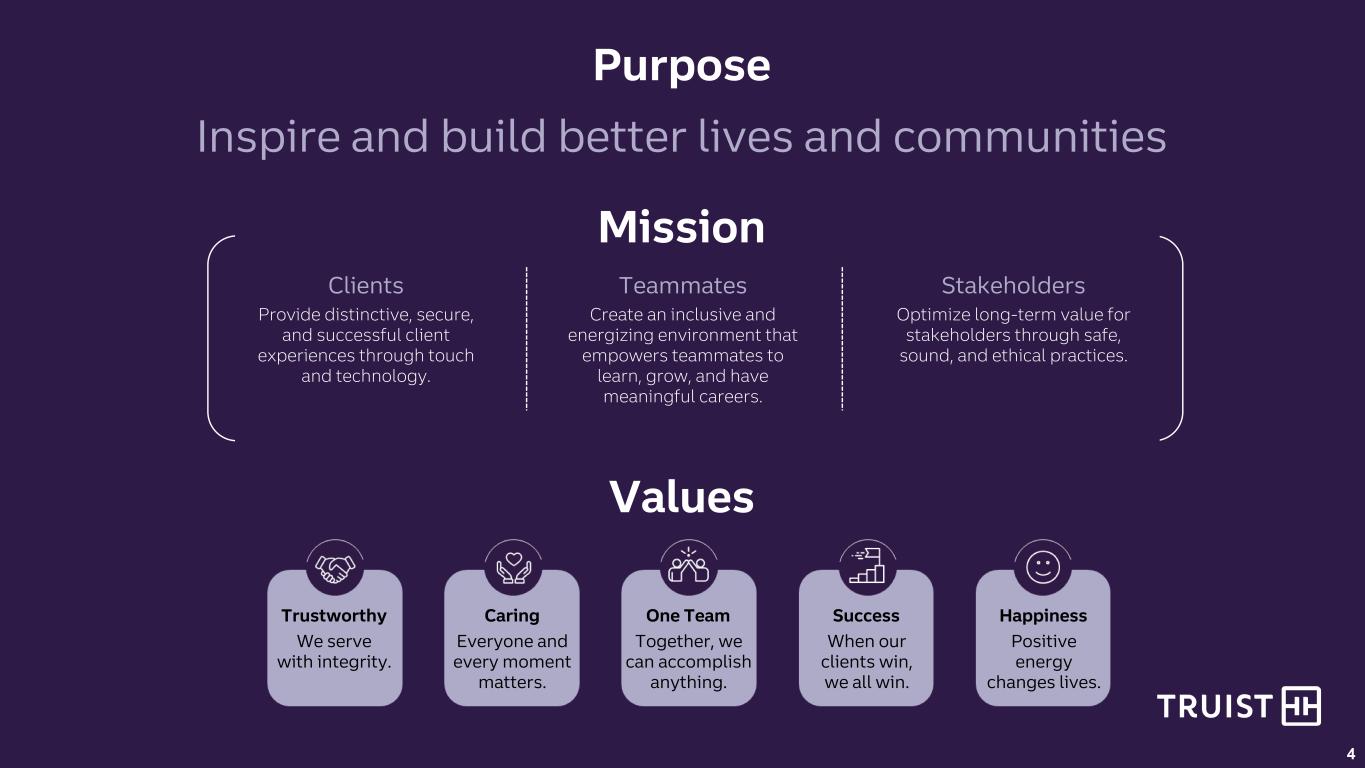 3 Non-GAAP Information This presentation contains financial information and performance measures determined by methods other than in accordance with accounting principles generally accepted in the United States of America ("GAAP"). Truist’s management uses these “non-GAAP” measures in their analysis of Truist’s performance and the efficiency of its operations. Management believes these non-GAAP measures are useful to investors because they provide a greater understanding of ongoing operations, enhance comparability of results with prior periods and demonstrate the effects of significant items in the current period. Truist believes a meaningful analysis of its financial performance requires an understanding of the factors underlying that performance. These disclosures should not be viewed as a substitute for financial measures determined in accordance with GAAP, nor are they necessarily comparable to non-GAAP performance measures that may be presented by other companies. Below is a listing of the types of non-GAAP measures used in this presentation: Adjusted Net income Available to Common Shareholders and Adjusted Diluted Earnings Per Share - Adjusted net income available to common shareholders and adjusted diluted earnings per share are non-GAAP in that these measures exclude selected items, net of tax. Truist’s management uses these measures in their analysis of Truist’s performance. Truist’s management believes these measures provide a greater understanding of ongoing operations and enhance comparability of results with prior periods, as well as demonstrate the effects of significant gains and charges. Adjusted Efficiency Ratio, Adjusted Fee Income, and Related Measures - The adjusted efficiency ratio is non-GAAP in that it excludes securities gains and losses, amortization of intangible assets, restructuring charges, and other selected items. Adjusted revenue and adjusted noninterest expense are related measures used to calculate the adjusted efficiency ratio. Additionally, the adjusted fee income ratio is non-GAAP in that it excludes securities gains and losses and other selected items, and is calculated using adjusted revenue and adjusted noninterest income. Adjusted revenue and adjusted noninterest income exclude securities gains and losses and other selected items. Adjusted noninterest expense excludes restructuring charges, and other selected items. Truist’s management calculated these measures based on Truist’s continuing operations. Truist’s management uses these measures in their analysis of Truist’s performance. Truist’s management believes these measures provide a greater understanding of ongoing operations and enhance comparability of results with prior periods, as well as demonstrate the effects of significant gains and charges. Pre-Provision Net Revenue (PPNR) - Pre-provision net revenue is a non-GAAP measure that adjusts net income determined in accordance with GAAP to exclude the impact of the provision for credit losses and provision for income taxes. Adjusted pre-provision net revenue is a non-GAAP measure that additionally excludes securities gains (losses), restructuring charges, and other selected items. Truist’s management calculated these measures based on Truist’s continuing operations. Truist’s management believes these measures provide a greater understanding of ongoing operations and enhance comparability of results with prior periods. Tangible Common Equity and Related Measures - Tangible common equity and related measures, including ROTCE and TBVPS, are non-GAAP measures that exclude the impact of intangible assets, net of deferred taxes, and their related amortization. These measures are useful for evaluating the performance of a business consistently, whether acquired or developed internally. Truist’s management uses these measures to assess profitability, returns relative to balance sheet risk, and shareholder value. A copy of this presentation is available on the Truist Investor Relations website, ir.truist.com.