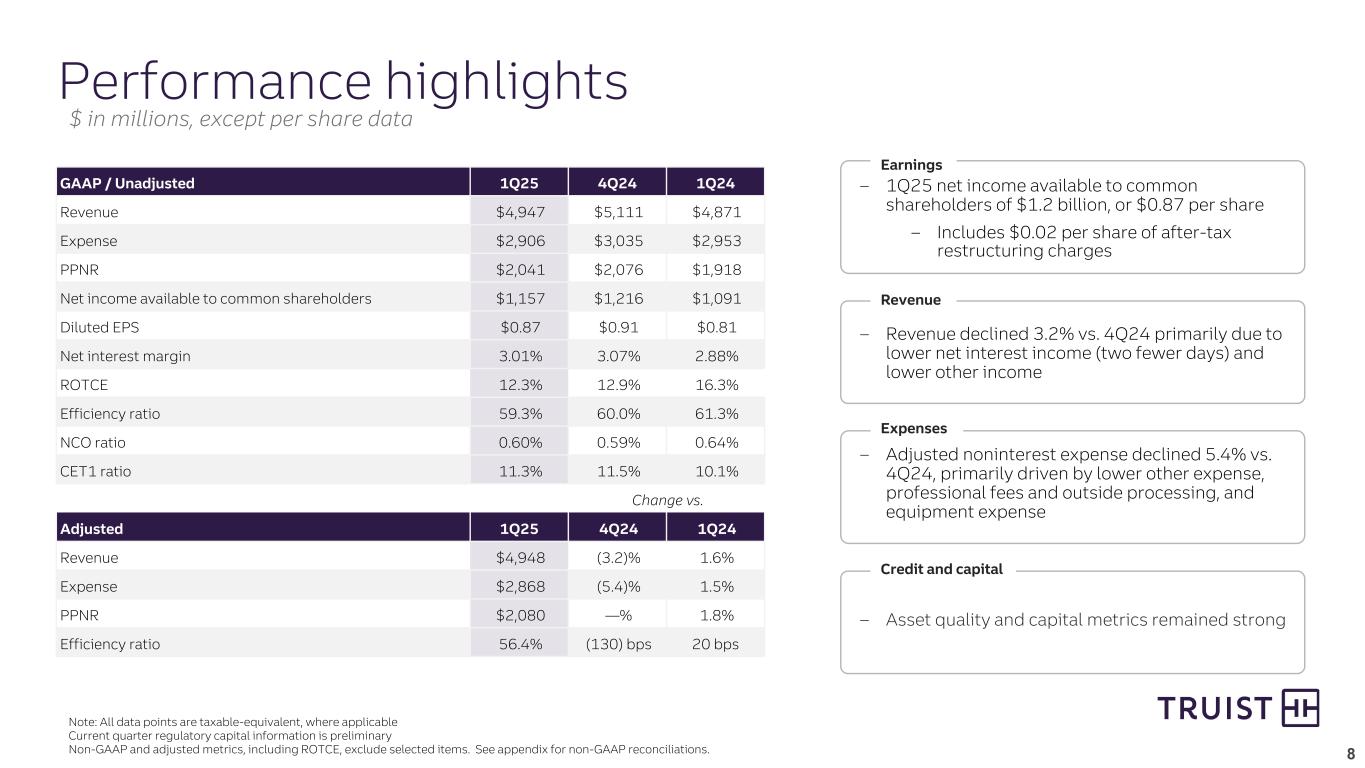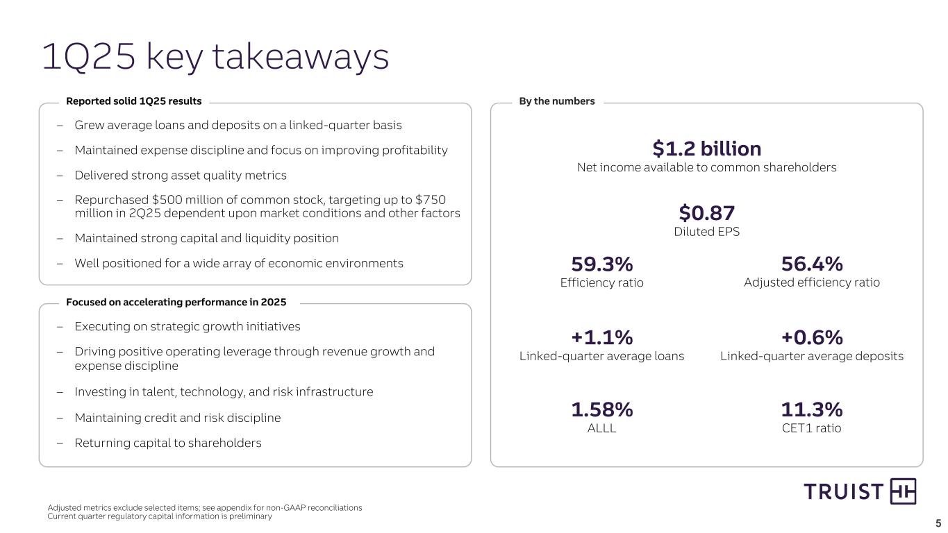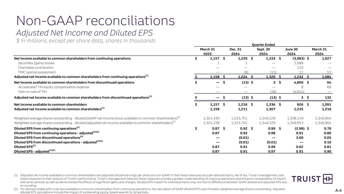 A-4 Quarter Ended March 31 Dec. 31 Sept. 30 June 30 March 31 2025 2024 2024 2024 2024 Net Income available to common shareholders from continuing operations $ 1,157 $ 1,229 $ 1,333 $ (3,983) $ 1,027 Securities (gains) losses 1 1 — 5,089 — Charitable contribution — — — 115 — FDIC special assessment — (6) (13) 11 57 Adjusted net income available to common shareholders from continuing operations(1) $ 1,158 $ 1,224 $ 1,320 $ 1,232 $ 1,084 Net Income available to common shareholders from discontinued operations $ — $ (13) $ 3 $ 4,809 $ 64 Accelerated TIH equity compensation expense — — — 8 68 Gain on sale of TIH — — (16) (4,814) — Adjusted net income available to common shareholders from discontinued operations(1) $ — $ (13) $ (13) $ 3 $ 132 Net income available to common shareholders $ 1,157 $ 1,216 $ 1,336 $ 826 $ 1,091 Adjusted net income available to common shareholders(1) 1,158 1,211 1,307 1,235 1,216 Weighted average shares outstanding - diluted (GAAP net income (loss) available to common shareholders)(2) 1,324,339 1,333,701 1,349,129 1,338,149 1,346,904 Weighted average shares outstanding - diluted (adjusted net income available to common shareholders)(2) 1,324,339 1,333,701 1,349,129 1,349,953 1,346,904 Diluted EPS from continuing operations(2) $ 0.87 $ 0.92 $ 0.99 $ (2.98) $ 0.76 Diluted EPS from continuing operations - adjusted(1)(2) 0.87 0.92 0.98 0.91 0.80 Diluted EPS from discontinued operations(2) — (0.01) — 3.60 0.05 Diluted EPS from discontinued operations - adjusted(1)(2) — (0.01) (0.01) — 0.10 Diluted EPS(2) 0.87 0.91 0.99 0.62 0.81 Diluted EPS - adjusted(1)(2) 0.87 0.91 0.97 0.91 0.90 Non-GAAP reconciliations Adjusted Net Income and Diluted EPS $ in millions, except per share data, shares in thousands (1) Adjusted net income available to common shareholders and adjusted diluted earnings per share are non-GAAP in that these measures exclude selected items, net of tax. Truist’s management uses these measures in their analysis of Truist’s performance. Truist’s management believes these measures provide a greater understanding of ongoing operations and enhance comparability of results with prior periods, as well as demonstrate the effects of significant gains and charges. Diluted EPS impact for individual items may not foot to difference between GAAP diluted and adjusted EPS due to rounding. (2) For periods ended with a net loss available to common shareholders from continuing operations, the calculation of GAAP diluted EPS uses the basic weighted average shares outstanding. Adjusted diluted EPS calculations include the impact of outstanding equity-based awards for all periods.