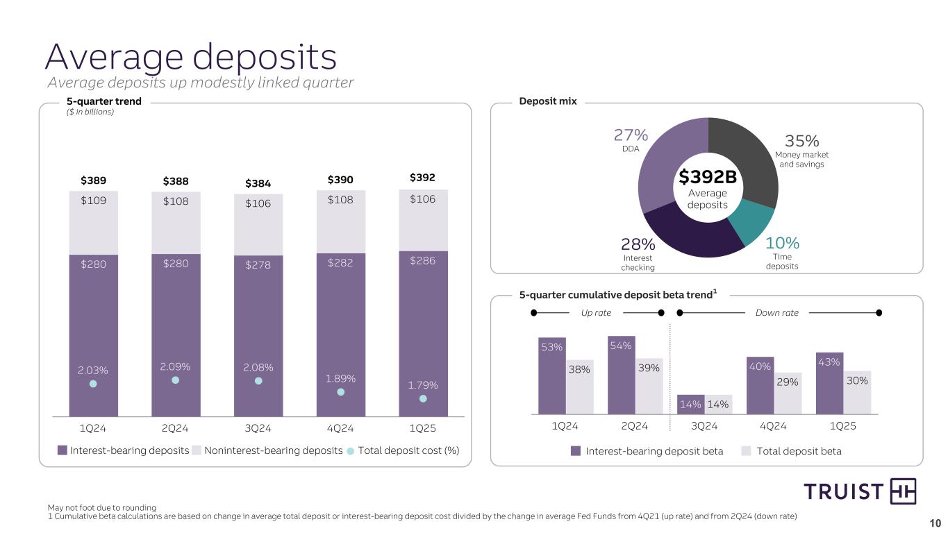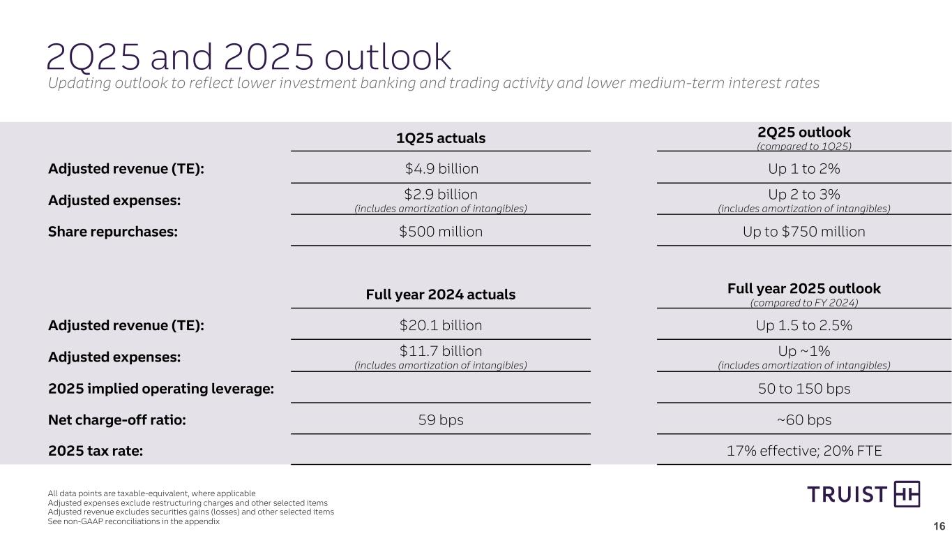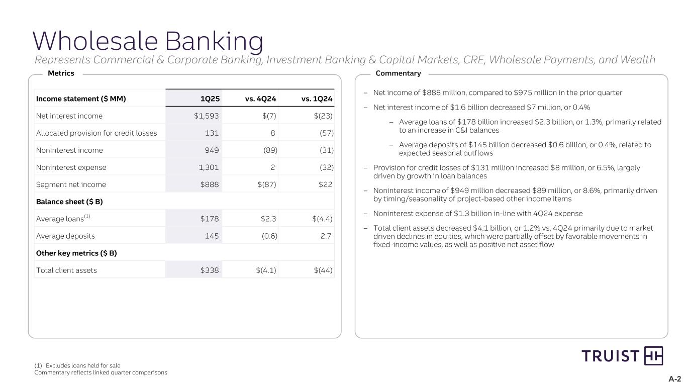 A-4 Quarter Ended March 31 Dec. 31 Sept. 30 June 30 March 31 2025 2024 2024 2024 2024 Net Income available to common shareholders from continuing operations $ 1,157 $ 1,229 $ 1,333 $ (3,983) $ 1,027 Securities (gains) losses 1 1 — 5,089 — Charitable contribution — — — 115 — FDIC special assessment — (6) (13) 11 57 Adjusted net income available to common shareholders from continuing operations(1) $ 1,158 $ 1,224 $ 1,320 $ 1,232 $ 1,084 Net Income available to common shareholders from discontinued operations $ — $ (13) $ 3 $ 4,809 $ 64 Accelerated TIH equity compensation expense — — — 8 68 Gain on sale of TIH — — (16) (4,814) — Adjusted net income available to common shareholders from discontinued operations(1) $ — $ (13) $ (13) $ 3 $ 132 Net income available to common shareholders $ 1,157 $ 1,216 $ 1,336 $ 826 $ 1,091 Adjusted net income available to common shareholders(1) 1,158 1,211 1,307 1,235 1,216 Weighted average shares outstanding - diluted (GAAP net income (loss) available to common shareholders)(2) 1,324,339 1,333,701 1,349,129 1,338,149 1,346,904 Weighted average shares outstanding - diluted (adjusted net income available to common shareholders)(2) 1,324,339 1,333,701 1,349,129 1,349,953 1,346,904 Diluted EPS from continuing operations(2) $ 0.87 $ 0.92 $ 0.99 $ (2.98) $ 0.76 Diluted EPS from continuing operations - adjusted(1)(2) 0.87 0.92 0.98 0.91 0.80 Diluted EPS from discontinued operations(2) — (0.01) — 3.60 0.05 Diluted EPS from discontinued operations - adjusted(1)(2) — (0.01) (0.01) — 0.10 Diluted EPS(2) 0.87 0.91 0.99 0.62 0.81 Diluted EPS - adjusted(1)(2) 0.87 0.91 0.97 0.91 0.90 Non-GAAP reconciliations Adjusted Net Income and Diluted EPS $ in millions, except per share data, shares in thousands (1) Adjusted net income available to common shareholders and adjusted diluted earnings per share are non-GAAP in that these measures exclude selected items, net of tax. Truist’s management uses these measures in their analysis of Truist’s performance. Truist’s management believes these measures provide a greater understanding of ongoing operations and enhance comparability of results with prior periods, as well as demonstrate the effects of significant gains and charges. Diluted EPS impact for individual items may not foot to difference between GAAP diluted and adjusted EPS due to rounding. (2) For periods ended with a net loss available to common shareholders from continuing operations, the calculation of GAAP diluted EPS uses the basic weighted average shares outstanding. Adjusted diluted EPS calculations include the impact of outstanding equity-based awards for all periods.