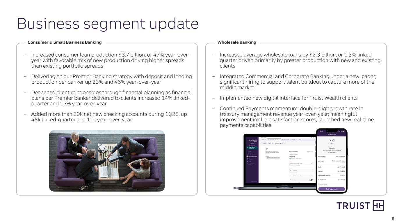5 – Grew average loans and deposits on a linked-quarter basis – Maintained expense discipline and focus on improving profitability – Delivered strong asset quality metrics – Repurchased $500 million of common stock, targeting up to $750 million in 2Q25 dependent upon market conditions and other factors – Maintained strong capital and liquidity position – Well positioned for a wide array of economic environments 1Q25 key takeaways Reported solid 1Q25 results By the numbers – Executing on strategic growth initiatives – Driving positive operating leverage through revenue growth and expense discipline – Investing in talent, technology, and risk infrastructure – Maintaining credit and risk discipline – Returning capital to shareholders Focused on accelerating performance in 2025 Adjusted metrics exclude selected items; see appendix for non-GAAP reconciliations Current quarter regulatory capital information is preliminary $1.2 billion Net income available to common shareholders $0.87 Diluted EPS 59.3% Efficiency ratio +1.1% Linked-quarter average loans +0.6% Linked-quarter average deposits 56.4% Adjusted efficiency ratio 1.58% ALLL 11.3% CET1 ratio