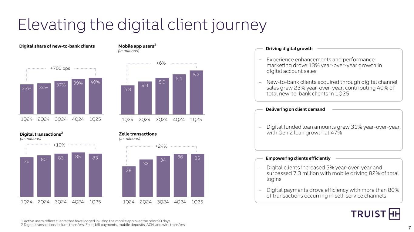 6 – Increased consumer loan production $3.7 billion, or 47% year-over- year with favorable mix of new production driving higher spreads than existing portfolio spreads – Delivering on our Premier Banking strategy with deposit and lending production per banker up 23% and 46% year-over-year – Deepened client relationships through financial planning as financial plans per Premier banker delivered to clients increased 14% linked- quarter and 15% year-over-year – Added more than 39k net new checking accounts during 1Q25, up 45k linked-quarter and 11k year-over-year Business segment update Consumer & Small Business Banking – Increased average wholesale loans by $2.3 billion, or 1.3% linked quarter driven primarily by greater production with new and existing clients – Integrated Commercial and Corporate Banking under a new leader; significant hiring to support talent buildout to capture more of the middle market – Implemented new digital interface for Truist Wealth clients – Continued Payments momentum: double-digit growth rate in treasury management revenue year-over-year; meaningful improvement in client satisfaction scores; launched new real-time payments capabilities Wholesale Banking