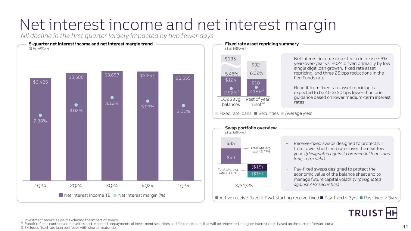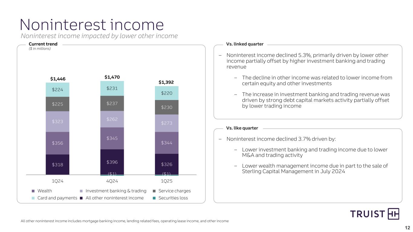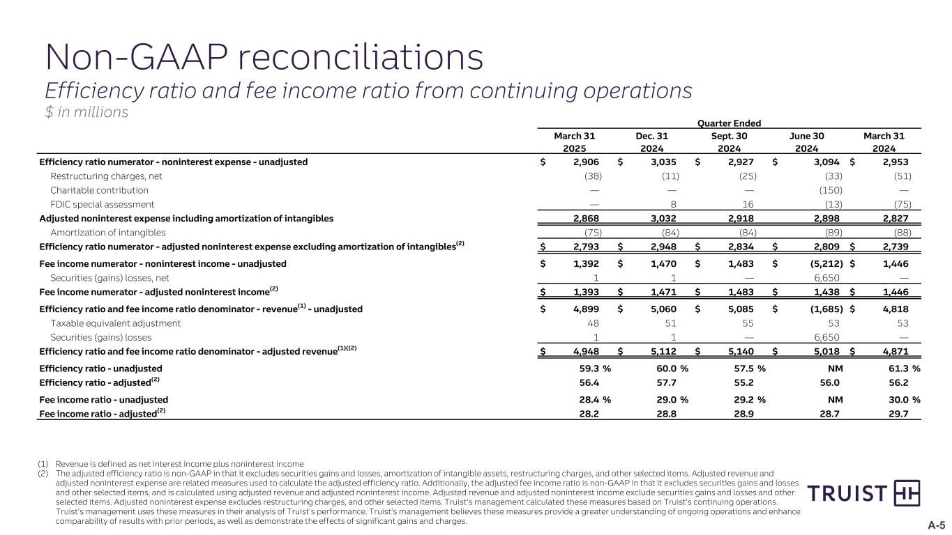A-5 Non-GAAP reconciliations Efficiency ratio and fee income ratio from continuing operations $ in millions (1) Revenue is defined as net interest income plus noninterest income (2) The adjusted efficiency ratio is non-GAAP in that it excludes securities gains and losses, amortization of intangible assets, restructuring charges, and other selected items. Adjusted revenue and adjusted noninterest expense are related measures used to calculate the adjusted efficiency ratio. Additionally, the adjusted fee income ratio is non-GAAP in that it excludes securities gains and losses and other selected items, and is calculated using adjusted revenue and adjusted noninterest income. Adjusted revenue and adjusted noninterest income exclude securities gains and losses and other selected items. Adjusted noninterest expense excludes restructuring charges, and other selected items. Truist’s management calculated these measures based on Truist’s continuing operations. Truist’s management uses these measures in their analysis of Truist’s performance. Truist’s management believes these measures provide a greater understanding of ongoing operations and enhance comparability of results with prior periods, as well as demonstrate the effects of significant gains and charges.   Quarter Ended   March 31 Dec. 31 Sept. 30 June 30 March 31 2025 2024 2024 2024 2024 Efficiency ratio numerator - noninterest expense - unadjusted $ 2,906 $ 3,035 $ 2,927 $ 3,094 $ 2,953 Restructuring charges, net (38) (11) (25) (33) (51) Charitable contribution — — — (150) — FDIC special assessment — 8 16 (13) (75) Adjusted noninterest expense including amortization of intangibles 2,868 3,032 2,918 2,898 2,827 Amortization of intangibles (75) (84) (84) (89) (88) Efficiency ratio numerator - adjusted noninterest expense excluding amortization of intangibles(2) $ 2,793 $ 2,948 $ 2,834 $ 2,809 $ 2,739 Fee income numerator - noninterest income - unadjusted $ 1,392 $ 1,470 $ 1,483 $ (5,212) $ 1,446 Securities (gains) losses, net 1 1 — 6,650 — Fee income numerator - adjusted noninterest income(2) $ 1,393 $ 1,471 $ 1,483 $ 1,438 $ 1,446 Efficiency ratio and fee income ratio denominator - revenue(1) - unadjusted $ 4,899 $ 5,060 $ 5,085 $ (1,685) $ 4,818 Taxable equivalent adjustment 48 51 55 53 53 Securities (gains) losses 1 1 — 6,650 — Efficiency ratio and fee income ratio denominator - adjusted revenue(1)((2) $ 4,948 $ 5,112 $ 5,140 $ 5,018 $ 4,871 Efficiency ratio - unadjusted 59.3 % 60.0 % 57.5 % NM 61.3 % Efficiency ratio - adjusted(2) 56.4 57.7 55.2 56.0 56.2 Fee income ratio - unadjusted 28.4 % 29.0 % 29.2 % NM 30.0 % Fee income ratio - adjusted(2) 28.2 28.8 28.9 28.7 29.7