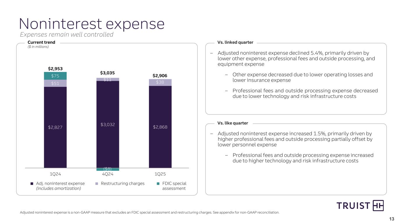 12 $318 $396 $326 $356 $345 $344 $323 $262 $273 $225 $237 $230 $224 $231 $220 Noninterest income Current trend ($ in millions) Wealth Investment banking & trading Service charges Card and payments All other noninterest income All other noninterest income includes mortgage banking income, lending related fees, operating lease income, and other income Vs. linked quarter – Noninterest income declined 5.3%, primarily driven by lower other income partially offset by higher investment banking and trading revenue – The decline in other income was related to lower income from certain equity and other investments – The increase in investment banking and trading revenue was driven by strong debt capital markets activity partially offset by lower trading income Vs. like quarter – Noninterest income declined 3.7% driven by: – Lower investment banking and trading income due to lower M&A and trading activity – Lower wealth management income due in part to the sale of Sterling Capital Management in July 2024 Securities loss ($1) 1Q24 4Q24 1Q25 $1,446 $1,470 $1,392 ($1) Noninterest income impacted by lower other income