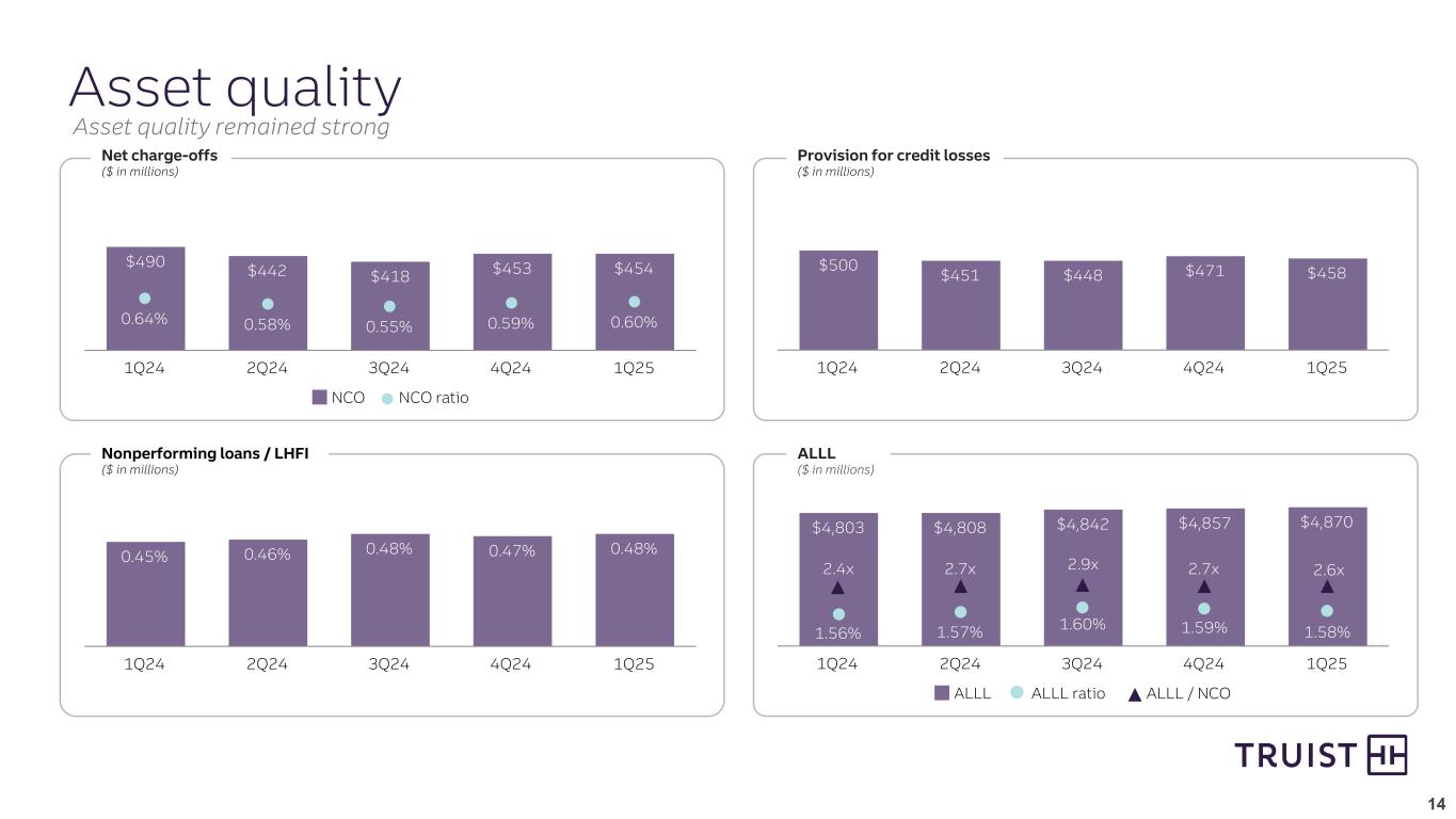 13 $2,827 $3,032 $2,868 Noninterest expense Adjusted noninterest expense is a non-GAAP measure that excludes an FDIC special assessment and restructuring charges. See appendix for non-GAAP reconciliation. Current trend ($ in millions) Adj. noninterest expense (includes amortization) Restructuring charges FDIC special assessment Vs. linked quarter – Adjusted noninterest expense declined 5.4%, primarily driven by lower other expense, professional fees and outside processing, and equipment expense – Other expense decreased due to lower operating losses and lower insurance expense – Professional fees and outside processing expense decreased due to lower technology and risk infrastructure costs Vs. like quarter – Adjusted noninterest expense increased 1.5%, primarily driven by higher professional fees and outside processing partially offset by lower personnel expense – Professional fees and outside processing expense increased due to higher technology and risk infrastructure costs 1Q24 4Q24 1Q25 ($8) $11 $51 $75 $38 $2,953 $3,035 $2,906 Expenses remain well controlled