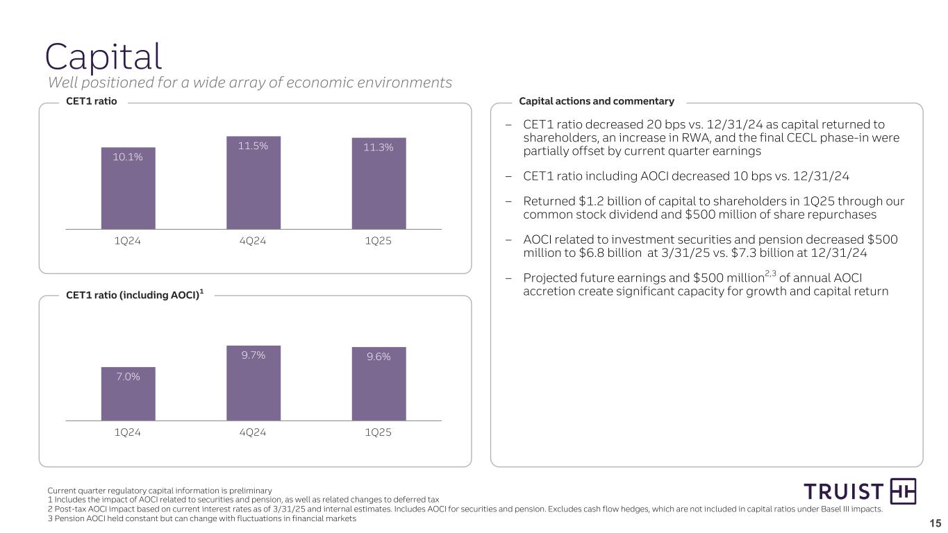 14 0.45% 0.46% 0.48% 0.47% 0.48% 1Q24 2Q24 3Q24 4Q24 1Q25 $500 $451 $448 $471 $458 1Q24 2Q24 3Q24 4Q24 1Q25 $490 $442 $418 $453 $454 0.64% 0.58% 0.55% 0.59% 0.60% NCO NCO ratio 1Q24 2Q24 3Q24 4Q24 1Q25 Asset quality $4,803 $4,808 $4,842 $4,857 $4,870 ALLL ALLL ratio ALLL / NCO 1Q24 2Q24 3Q24 4Q24 1Q25 2.4x 1.56% 2.7x 1.57% 1.60% 2.9x Net charge-offs ($ in millions) Nonperforming loans / LHFI ($ in millions) 1.59% 2.7x ALLL ($ in millions) Provision for credit losses ($ in millions) Asset quality remained strong 1.58% 2.6x
