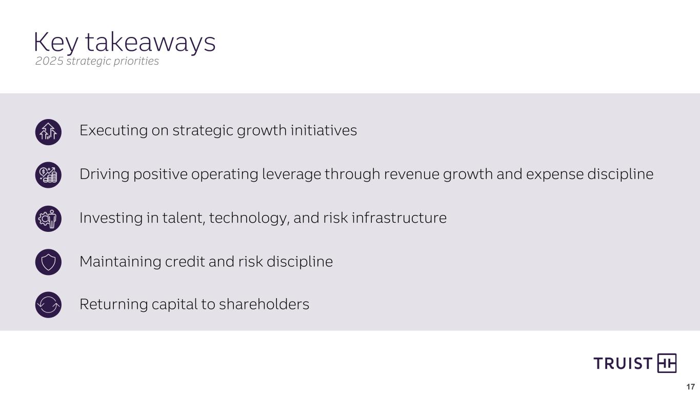 17 Key takeaways Executing on strategic growth initiatives Driving positive operating leverage through revenue growth and expense discipline Investing in talent, technology, and risk infrastructure Maintaining credit and risk discipline Returning capital to shareholders 2025 strategic priorities