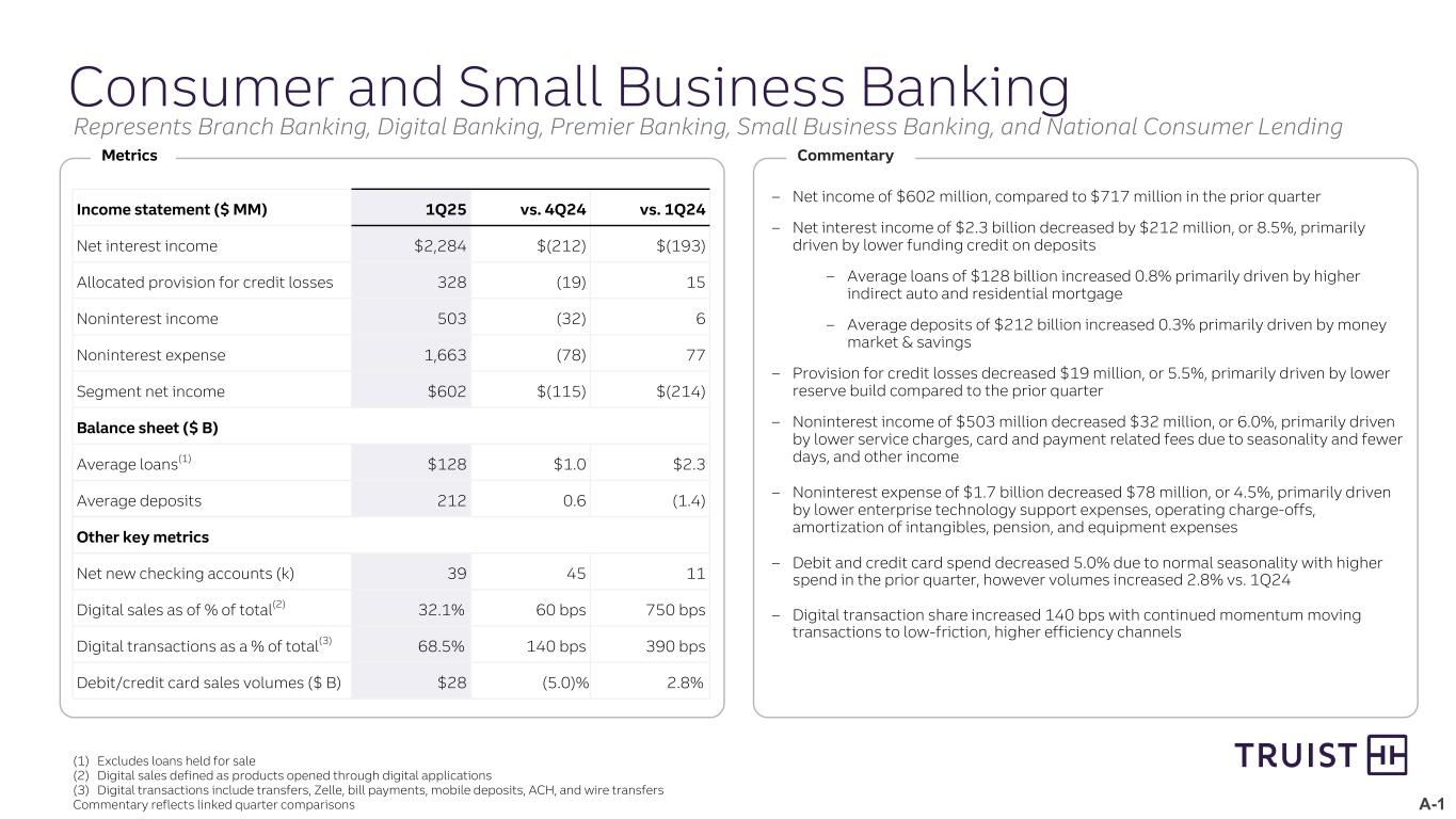 A-1 – Net income of $602 million, compared to $717 million in the prior quarter – Net interest income of $2.3 billion decreased by $212 million, or 8.5%, primarily driven by lower funding credit on deposits – Average loans of $128 billion increased 0.8% primarily driven by higher indirect auto and residential mortgage – Average deposits of $212 billion increased 0.3% primarily driven by money market & savings – Provision for credit losses decreased $19 million, or 5.5%, primarily driven by lower reserve build compared to the prior quarter – Noninterest income of $503 million decreased $32 million, or 6.0%, primarily driven by lower service charges, card and payment related fees due to seasonality and fewer days, and other income – Noninterest expense of $1.7 billion decreased $78 million, or 4.5%, primarily driven by lower enterprise technology support expenses, operating charge-offs, amortization of intangibles, pension, and equipment expenses – Debit and credit card spend decreased 5.0% due to normal seasonality with higher spend in the prior quarter, however volumes increased 2.8% vs. 1Q24 – Digital transaction share increased 140 bps with continued momentum moving transactions to low-friction, higher efficiency channels Consumer and Small Business Banking (1) Excludes loans held for sale (2) Digital sales defined as products opened through digital applications (3) Digital transactions include transfers, Zelle, bill payments, mobile deposits, ACH, and wire transfers Commentary reflects linked quarter comparisons Metrics Commentary Income statement ($ MM) 1Q25 vs. 4Q24 vs. 1Q24 Net interest income $2,284 $(212) $(193) Allocated provision for credit losses 328 (19) 15 Noninterest income 503 (32) 6 Noninterest expense 1,663 (78) 77 Segment net income $602 $(115) $(214) Balance sheet ($ B) Average loans(1) $128 $1.0 $2.3 Average deposits 212 0.6 (1.4) Other key metrics Net new checking accounts (k) 39 45 11 Digital sales as of % of total(2) 32.1% 60 bps 750 bps Digital transactions as a % of total(3) 68.5% 140 bps 390 bps Debit/credit card sales volumes ($ B) $28 (5.0) % 2.8% Represents Branch Banking, Digital Banking, Premier Banking, Small Business Banking, and National Consumer Lending