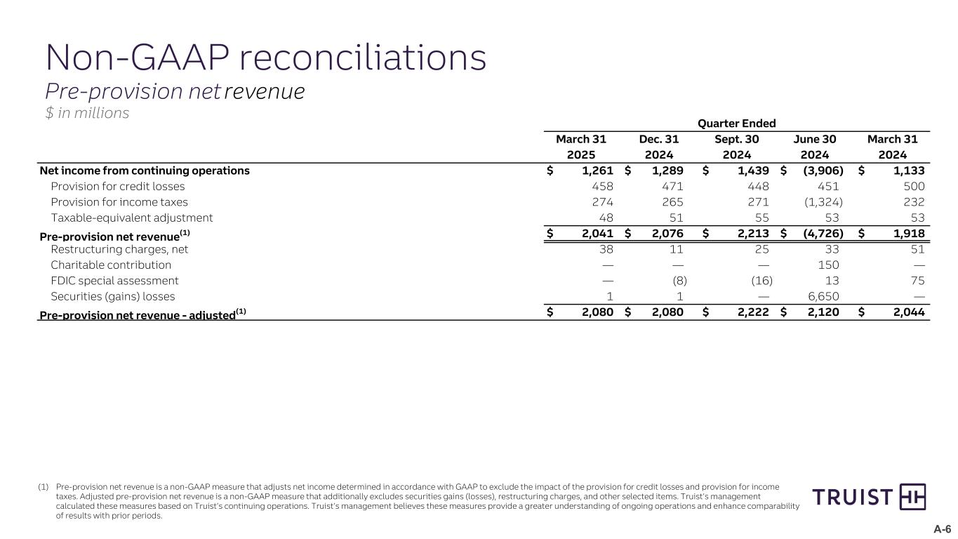 A-6 Non-GAAP reconciliations Pre-provision net revenue $ in millions (1) Pre-provision net revenue is a non-GAAP measure that adjusts net income determined in accordance with GAAP to exclude the impact of the provision for credit losses and provision for income taxes. Adjusted pre-provision net revenue is a non-GAAP measure that additionally excludes securities gains (losses), restructuring charges, and other selected items. Truist’s management calculated these measures based on Truist’s continuing operations. Truist’s management believes these measures provide a greater understanding of ongoing operations and enhance comparability of results with prior periods.   Quarter Ended   March 31 Dec. 31 Sept. 30 June 30 March 31 2025 2024 2024 2024 2024 Net income from continuing operations $ 1,261 $ 1,289 $ 1,439 $ (3,906) $ 1,133 Provision for credit losses 458 471 448 451 500 Provision for income taxes 274 265 271 (1,324) 232 Taxable-equivalent adjustment 48 51 55 53 53 Pre-provision net revenue(1) $ 2,041 $ 2,076 $ 2,213 $ (4,726) $ 1,918 Restructuring charges, net 38 11 25 33 51 Charitable contribution — — — 150 — FDIC special assessment — (8) (16) 13 75 Securities (gains) losses 1 1 — 6,650 — Pre-provision net revenue - adjusted(1) $ 2,080 $ 2,080 $ 2,222 $ 2,120 $ 2,044