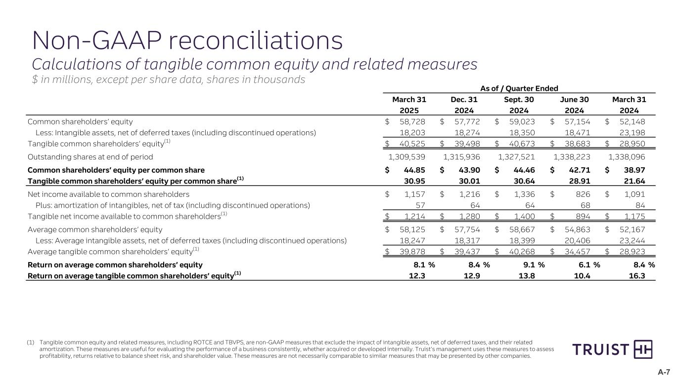 A-7 Non-GAAP reconciliations Calculations of tangible common equity and related measures $ in millions, except per share data, shares in thousands (1) Tangible common equity and related measures, including ROTCE and TBVPS, are non-GAAP measures that exclude the impact of intangible assets, net of deferred taxes, and their related amortization. These measures are useful for evaluating the performance of a business consistently, whether acquired or developed internally. Truist’s management uses these measures to assess profitability, returns relative to balance sheet risk, and shareholder value. These measures are not necessarily comparable to similar measures that may be presented by other companies.   As of / Quarter Ended   March 31 Dec. 31 Sept. 30 June 30 March 31   2025 2024 2024 2024 2024 Common shareholders’ equity $ 58,728 $ 57,772 $ 59,023 $ 57,154 $ 52,148 Less: Intangible assets, net of deferred taxes (including discontinued operations) 18,203 18,274 18,350 18,471 23,198 Tangible common shareholders’ equity(1) $ 40,525 $ 39,498 $ 40,673 $ 38,683 $ 28,950 Outstanding shares at end of period 1,309,539 1,315,936 1,327,521 1,338,223 1,338,096 Common shareholders’ equity per common share $ 44.85 $ 43.90 $ 44.46 $ 42.71 $ 38.97 Tangible common shareholders’ equity per common share(1) 30.95 30.01 30.64 28.91 21.64 Net income available to common shareholders $ 1,157 $ 1,216 $ 1,336 $ 826 $ 1,091 Plus: amortization of intangibles, net of tax (including discontinued operations) 57 64 64 68 84 Tangible net income available to common shareholders(1) $ 1,214 $ 1,280 $ 1,400 $ 894 $ 1,175 Average common shareholders’ equity $ 58,125 $ 57,754 $ 58,667 $ 54,863 $ 52,167 Less: Average intangible assets, net of deferred taxes (including discontinued operations) 18,247 18,317 18,399 20,406 23,244 Average tangible common shareholders’ equity(1) $ 39,878 $ 39,437 $ 40,268 $ 34,457 $ 28,923 Return on average common shareholders’ equity 8.1 % 8.4 % 9.1 % 6.1 % 8.4 % Return on average tangible common shareholders’ equity(1) 12.3 12.9 13.8 10.4 16.3