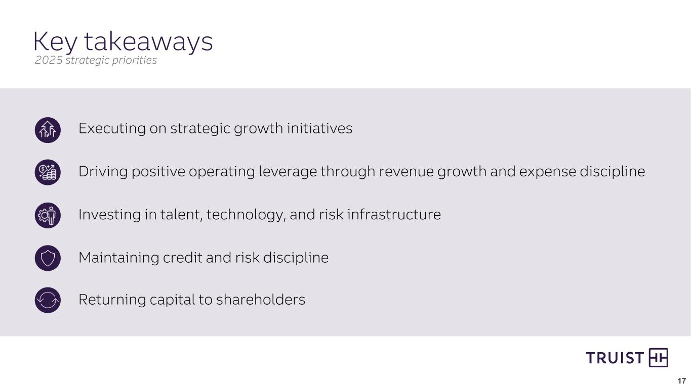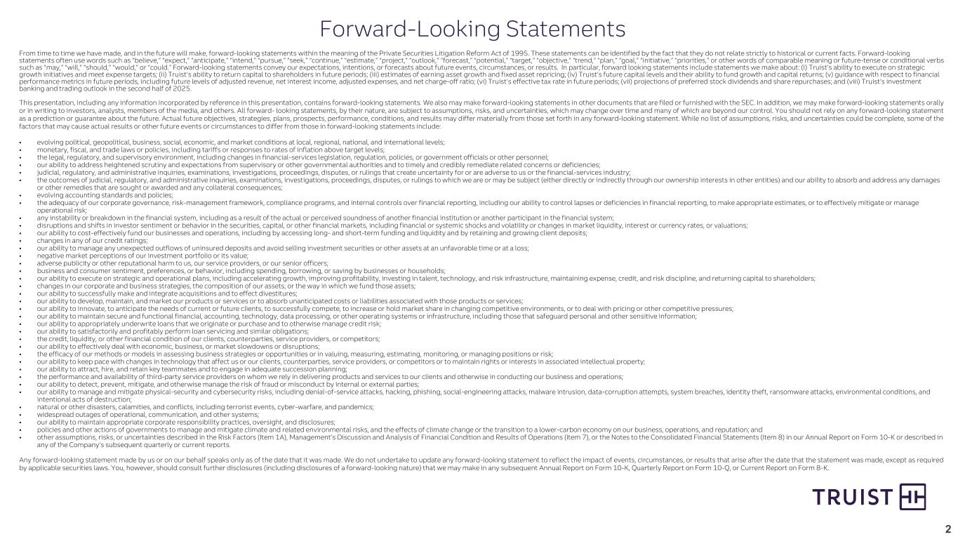 2 From time to time we have made, and in the future will make, forward-looking statements within the meaning of the Private Securities Litigation Reform Act of 1995. These statements can be identified by the fact that they do not relate strictly to historical or current facts. Forward-looking statements often use words such as “believe,” “expect,” “anticipate,” “intend,” “pursue,” “seek,” “continue,” “estimate,” “project,” “outlook,” “forecast,” “potential,” “target,” “objective,” “trend,” “plan,” “goal,” “initiative,” “priorities,” or other words of comparable meaning or future-tense or conditional verbs such as “may,” “will,” “should,” “would,” or “could.” Forward-looking statements convey our expectations, intentions, or forecasts about future events, circumstances, or results. In particular, forward looking statements include statements we make about: (i) Truist’s ability to execute on strategic growth initiatives and meet expense targets; (ii) Truist’s ability to return capital to shareholders in future periods; (iii) estimates of earning asset growth and fixed asset repricing; (iv) Truist’s future capital levels and their ability to fund growth and capital returns; (v) guidance with respect to financial performance metrics in future periods, including future levels of adjusted revenue, net interest income, adjusted expenses, and net charge-off ratio; (vi) Truist’s effective tax rate in future periods; (vii) projections of preferred stock dividends and share repurchases; and (viii) Truist’s investment banking and trading outlook in the second half of 2025. This presentation, including any information incorporated by reference in this presentation, contains forward-looking statements. We also may make forward-looking statements in other documents that are filed or furnished with the SEC. In addition, we may make forward-looking statements orally or in writing to investors, analysts, members of the media, and others. All forward- looking statements, by their nature, are subject to assumptions, risks, and uncertainties, which may change over time and many of which are beyond our control. You should not rely on any forward-looking statement as a prediction or guarantee about the future. Actual future objectives, strategies, plans, prospects, performance, conditions, and results may differ materially from those set forth in any forward-looking statement. While no list of assumptions, risks, and uncertainties could be complete, some of the factors that may cause actual results or other future events or circumstances to differ from those in forward-looking statements include: • evolving political, geopolitical, business, social, economic, and market conditions at local, regional, national, and international levels; • monetary, fiscal, and trade laws or policies, including tariffs or responses to rates of inflation above target levels; • the legal, regulatory, and supervisory environment, including changes in financial-services legislation, regulation, policies, or government officials or other personnel; • our ability to address heightened scrutiny and expectations from supervisory or other governmental authorities and to timely and credibly remediate related concerns or deficiencies; • judicial, regulatory, and administrative inquiries, examinations, investigations, proceedings, disputes, or rulings that create uncertainty for or are adverse to us or the financial-services industry; • the outcomes of judicial, regulatory, and administrative inquiries, examinations, investigations, proceedings, disputes, or rulings to which we are or may be subject (either directly or indirectly through our ownership interests in other entities) and our ability to absorb and address any damages or other remedies that are sought or awarded and any collateral consequences; • evolving accounting standards and policies; • the adequacy of our corporate governance, risk-management framework, compliance programs, and internal controls over financial reporting, including our ability to control lapses or deficiencies in financial reporting, to make appropriate estimates, or to effectively mitigate or manage operational risk; • any instability or breakdown in the financial system, including as a result of the actual or perceived soundness of another financial institution or another participant in the financial system; • disruptions and shifts in investor sentiment or behavior in the securities, capital, or other financial markets, including financial or systemic shocks and volatility or changes in market liquidity, interest or currency rates, or valuations; • our ability to cost-effectively fund our businesses and operations, including by accessing long- and short-term funding and liquidity and by retaining and growing client deposits; • changes in any of our credit ratings; • our ability to manage any unexpected outflows of uninsured deposits and avoid selling investment securities or other assets at an unfavorable time or at a loss; • negative market perceptions of our investment portfolio or its value; • adverse publicity or other reputational harm to us, our service providers, or our senior officers; • business and consumer sentiment, preferences, or behavior, including spending, borrowing, or saving by businesses or households; • our ability to execute on strategic and operational plans, including accelerating growth, improving profitability, investing in talent, technology, and risk infrastructure, maintaining expense, credit, and risk discipline, and returning capital to shareholders; • changes in our corporate and business strategies, the composition of our assets, or the way in which we fund those assets; • our ability to successfully make and integrate acquisitions and to effect divestitures; • our ability to develop, maintain, and market our products or services