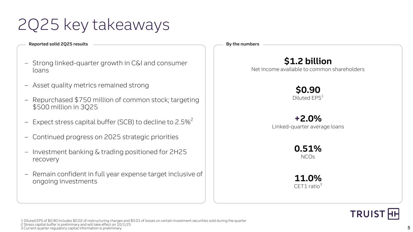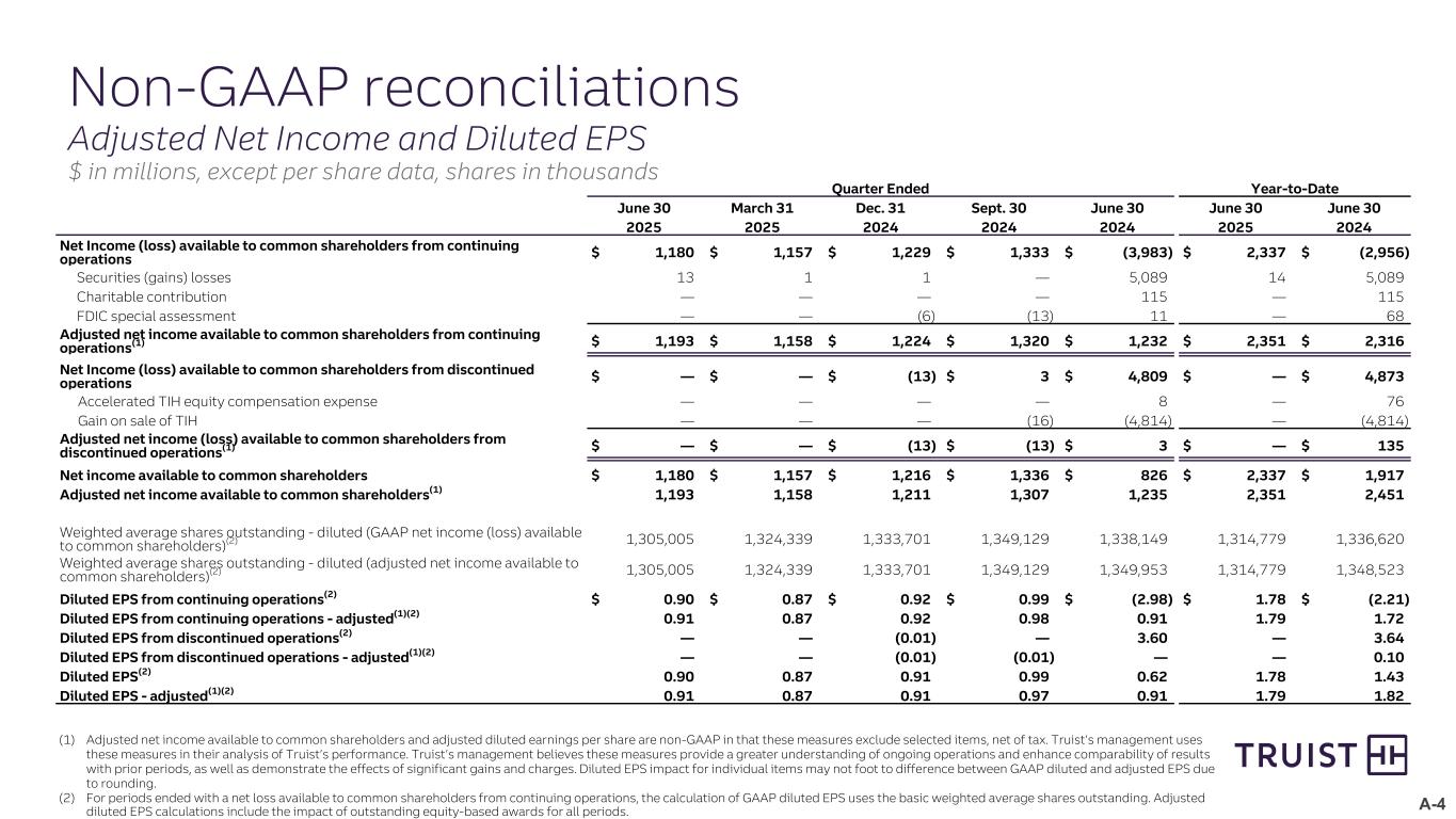 A-4 Quarter Ended Year-to-Date June 30 March 31 Dec. 31 Sept. 30 June 30 June 30 June 30 2025 2025 2024 2024 2024 2025 2024 Net Income (loss) available to common shareholders from continuing operations $ 1,180 $ 1,157 $ 1,229 $ 1,333 $ (3,983) $ 2,337 $ (2,956) Securities (gains) losses 13 1 1 — 5,089 14 5,089 Charitable contribution — — — — 115 — 115 FDIC special assessment — — (6) (13) 11 — 68 Adjusted net income available to common shareholders from continuing operations(1) $ 1,193 $ 1,158 $ 1,224 $ 1,320 $ 1,232 $ 2,351 $ 2,316 Net Income (loss) available to common shareholders from discontinued operations $ — $ — $ (13) $ 3 $ 4,809 $ — $ 4,873 Accelerated TIH equity compensation expense — — — — 8 — 76 Gain on sale of TIH — — — (16) (4,814) — (4,814) Adjusted net income (loss) available to common shareholders from discontinued operations(1) $ — $ — $ (13) $ (13) $ 3 $ — $ 135 Net income available to common shareholders $ 1,180 $ 1,157 $ 1,216 $ 1,336 $ 826 $ 2,337 $ 1,917 Adjusted net income available to common shareholders(1) 1,193 1,158 1,211 1,307 1,235 2,351 2,451 Weighted average shares outstanding - diluted (GAAP net income (loss) available to common shareholders)(2) 1,305,005 1,324,339 1,333,701 1,349,129 1,338,149 1,314,779 1,336,620 Weighted average shares outstanding - diluted (adjusted net income available to common shareholders)(2) 1,305,005 1,324,339 1,333,701 1,349,129 1,349,953 1,314,779 1,348,523 Diluted EPS from continuing operations(2) $ 0.90 $ 0.87 $ 0.92 $ 0.99 $ (2.98) $ 1.78 $ (2.21) Diluted EPS from continuing operations - adjusted(1)(2) 0.91 0.87 0.92 0.98 0.91 1.79 1.72 Diluted EPS from discontinued operations(2) — — (0.01) — 3.60 — 3.64 Diluted EPS from discontinued operations - adjusted(1)(2) — — (0.01) (0.01) — — 0.10 Diluted EPS(2) 0.90 0.87 0.91 0.99 0.62 1.78 1.43 Diluted EPS - adjusted(1)(2) 0.91 0.87 0.91 0.97 0.91 1.79 1.82 Non-GAAP reconciliations Adjusted Net Income and Diluted EPS $ in millions, except per share data, shares in thousands (1) Adjusted net income available to common shareholders and adjusted diluted earnings per share are non-GAAP in that these measures exclude selected items, net of tax. Truist’s management uses these measures in their analysis of Truist’s performance. Truist’s management believes these measures provide a greater understanding of ongoing operations and enhance comparability of results with prior periods, as well as demonstrate the effects of significant gains and charges. Diluted EPS impact for individual items may not foot to difference between GAAP diluted and adjusted EPS due to rounding. (2) For periods ended with a net loss available to common shareholders from continuing operations, the calculation of GAAP diluted EPS uses the basic weighted average shares outstanding. Adjusted diluted EPS calculations include the impact of outstanding equity-based awards for all periods.