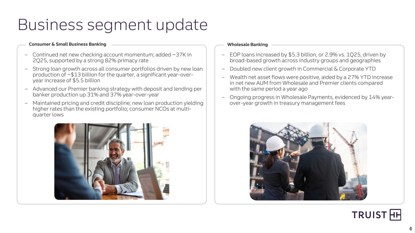 5 2Q25 key takeaways By the numbers 1 Diluted EPS of $0.90 includes $0.02 of restructuring charges and $0.01 of losses on certain investment securities sold during the quarter 2 Stress capital buffer is preliminary and will take effect on 10/1/25 3 Current quarter regulatory capital information is preliminary $1.2 billion Net income available to common shareholders $0.90 Diluted EPS1 +2.0% Linked-quarter average loans 0.51% NCOs 11.0% CET1 ratio3 – Strong linked-quarter growth in C&I and consumer loans – Asset quality metrics remained strong – Repurchased $750 million of common stock; targeting $500 million in 3Q25 – Expect stress capital buffer (SCB) to decline to 2.5%2 – Continued progress on 2025 strategic priorities – Investment banking & trading positioned for 2H25 recovery – Remain confident in full year expense target inclusive of ongoing investments Reported solid 2Q25 results