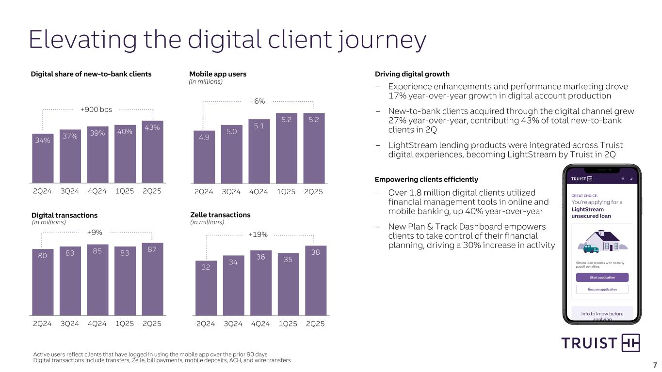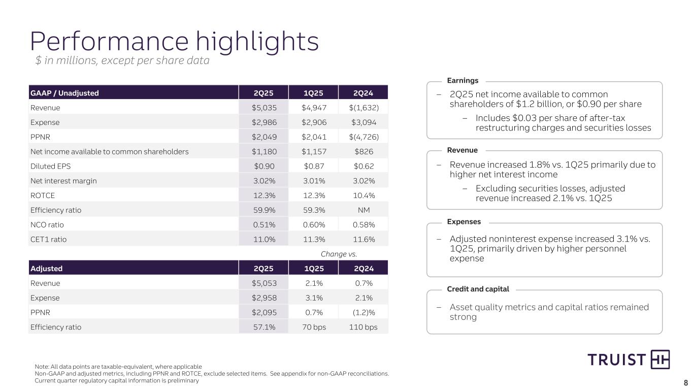7 80 83 85 83 87 2Q24 3Q24 4Q24 1Q25 2Q25 34% 37% 39% 40% 43% 2Q24 3Q24 4Q24 1Q25 2Q25 32 34 36 35 38 2Q24 3Q24 4Q24 1Q25 2Q25 Digital share of new-to-bank clients Mobile app users Digital transactions Zelle transactions (in millions) 4.9 5.0 5.1 5.2 5.2 2Q24 3Q24 4Q24 1Q25 2Q25 (in millions) Elevating the digital client journey Driving digital growth – Experience enhancements and performance marketing drove 17% year-over-year growth in digital account production – New-to-bank clients acquired through the digital channel grew 27% year-over-year, contributing 43% of total new-to-bank clients in 2Q – LightStream lending products were integrated across Truist digital experiences, becoming LightStream by Truist in 2Q +900 bps +6% +9% +19% Empowering clients efficiently – Over 1.8 million digital clients utilized financial management tools in online and mobile banking, up 40% year-over-year – New Plan & Track Dashboard empowers clients to take control of their financial planning, driving a 30% increase in activity Active users reflect clients that have logged in using the mobile app over the prior 90 days Digital transactions include transfers, Zelle, bill payments, mobile deposits, ACH, and wire transfers (in millions)
