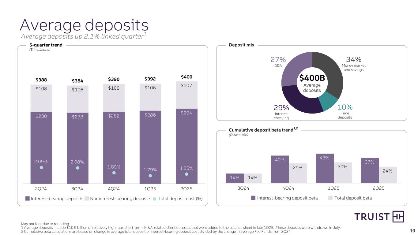 9 $306 $303 $303 $306 $313 $187 $183 $182 $184 $187 $120 $120 $121 $123 $126 6.44% 6.41% 6.12% 5.97% 6.01% Commercial LHFI Consumer and card LHFI Loans HFI yield (%) 2Q24 3Q24 4Q24 1Q25 2Q25 May not foot due to rounding Portfolio assignment based off loan purpose 5-quarter trend ($ in billions) Loan portfolio composition $313B Average loans 51% Commercial and industrial 6% CRE 3% Commercial construction 18% Residential mortgage 3% Home equity 8% Indirect auto 9% Other consumer 2% Credit card Average loans and leases HFI Average loans up 2.0% linked quarter driven by increased loan production