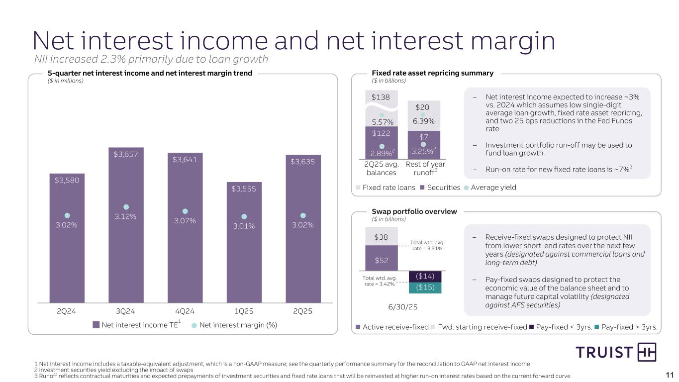 10 14% 40% 43% 37% 14% 29% 30% 24% Interest-bearing deposit beta Total deposit beta 3Q24 4Q24 1Q25 2Q25 Average deposits $388 $384 $390 $392 $280 $278 $282 $286 $294 $108 $106 $108 $106 $107 2.09% 2.08% 1.89% 1.79% 1.85% Interest-bearing deposits Noninterest-bearing deposits Total deposit cost (%) 2Q24 3Q24 4Q24 1Q25 2Q25 May not foot due to rounding 1 Average deposits include $10.9 billion of relatively high rate, short-term, M&A-related client deposits that were added to the balance sheet in late 1Q25. These deposits were withdrawn in July. 2 Cumulative beta calculations are based on change in average total deposit or interest-bearing deposit cost divided by the change in average Fed Funds from 2Q24 Deposit mix $400B Average deposits 34% Money market and savings 10% Time deposits 29% Interest checking 27% DDA Cumulative deposit beta trend1,2 (Down rate) 5-quarter trend ($ in billions) $400 Average deposits up 2.1% linked quarter1