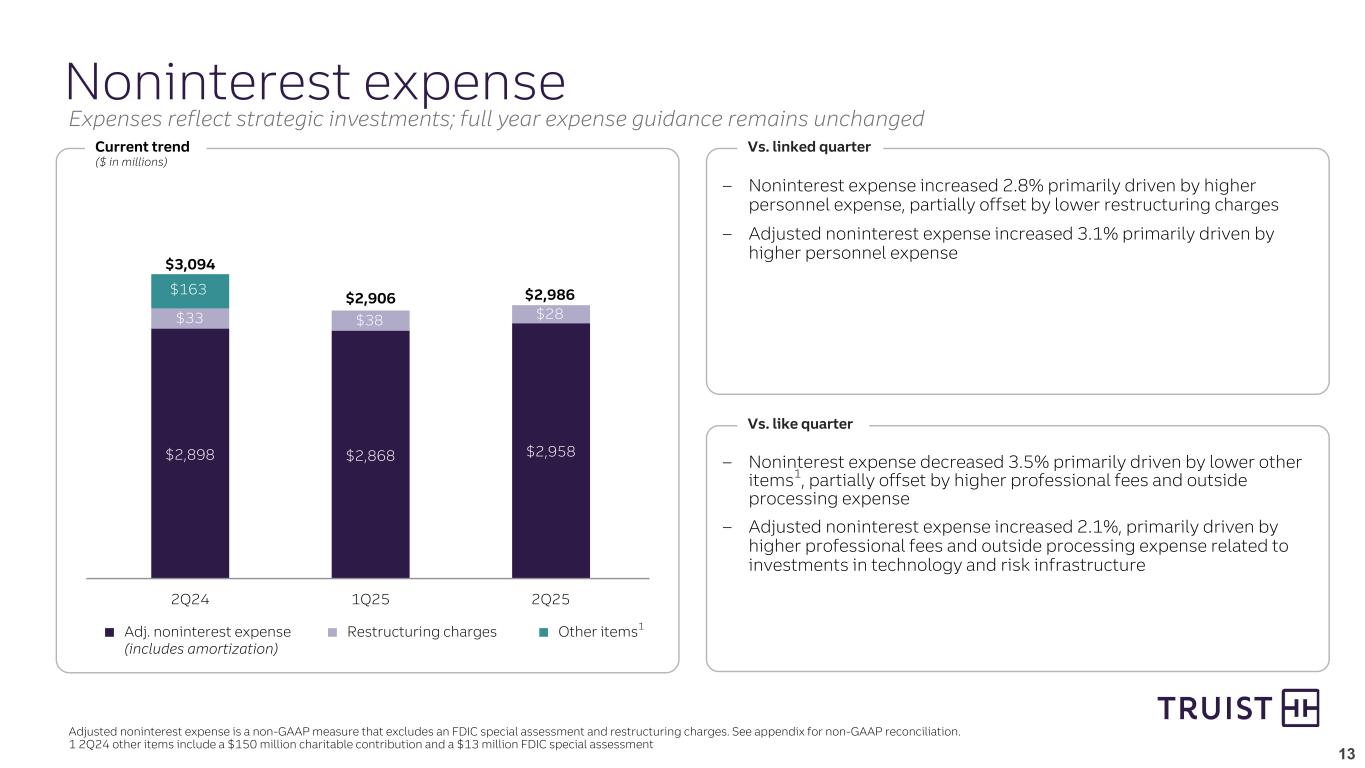 12 $329 $325 $406 $361 $344 $348 $286 $273 $205 $232 $230 $227 $230 $220 $232 Noninterest income Current trend ($ in millions) Wealth Investment banking & trading Service charges Card and payments All other noninterest income All other noninterest income includes mortgage banking income, lending related fees, operating lease income, and other income Adjusted noninterest income excludes securities losses. See appendix for non-GAAP reconciliation. Vs. linked quarter – GAAP and adjusted noninterest income increased 0.6% and 1.8%, respectively, primarily driven by higher other income, partially offset by lower investment banking and trading income – The increase in other income was largely driven by higher NQDCP income (offset in personnel expense) and income from certain equity and other investments – The decline in investment banking and trading income was largely impacted by lower trading, capital markets, and M&A fees Vs. like quarter – Noninterest income increased due to securities losses from the balance sheet repositioning in 2Q24 – Adjusted noninterest income decreased 1.4% driven by lower investment banking and trading income, partially offset by higher other income Securities loss ($1) 2Q24 1Q25 2Q25 $1,392 ~ GAAP noninterest income ($5,212) ($6,650) $1,400 ($18) Adj. noninterest income $1,438 GAAP noninterest income GAAP noninterest income Investment banking and trading well positioned for 2H25 improvement