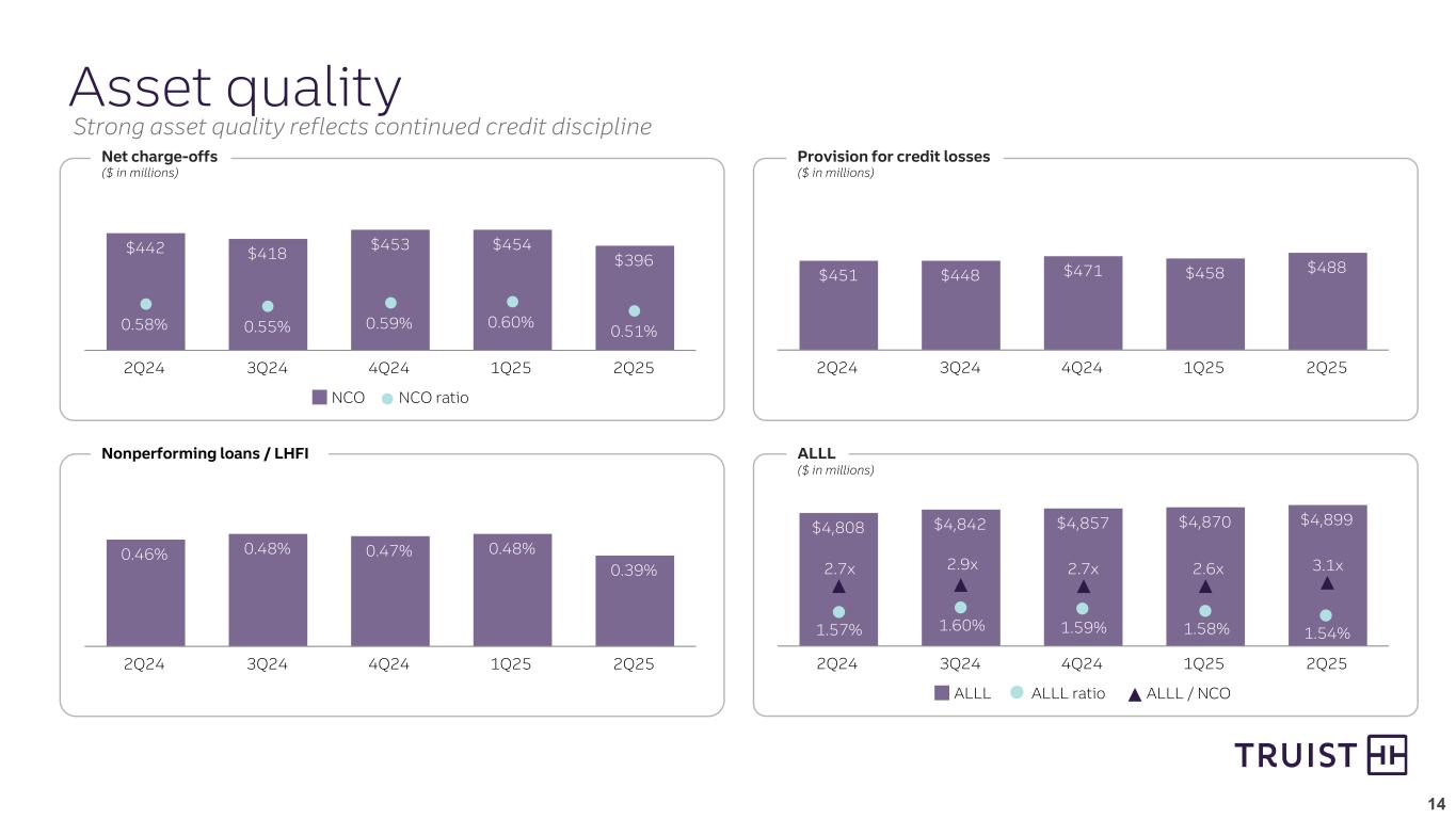 13 $2,898 $2,868 $2,958 Noninterest expense Adjusted noninterest expense is a non-GAAP measure that excludes an FDIC special assessment and restructuring charges. See appendix for non-GAAP reconciliation. 1 2Q24 other items include a $150 million charitable contribution and a $13 million FDIC special assessment Current trend ($ in millions) Adj. noninterest expense (includes amortization) Restructuring charges Vs. linked quarter Vs. like quarter $11 $38 – Noninterest expense increased 2.8% primarily driven by higher personnel expense, partially offset by lower restructuring charges – Adjusted noninterest expense increased 3.1% primarily driven by higher personnel expense – Noninterest expense decreased 3.5% primarily driven by lower other items1, partially offset by higher professional fees and outside processing expense – Adjusted noninterest expense increased 2.1%, primarily driven by higher professional fees and outside processing expense related to investments in technology and risk infrastructure Other items1 2Q24 1Q25 2Q25 $38$33 $163 $3,094 $2,906 $2,986 $28 Expenses reflect strategic investments; full year expense guidance remains unchanged