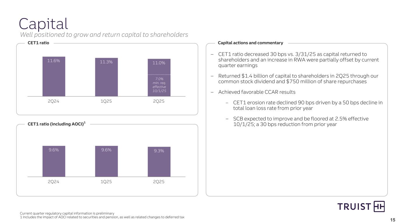 14 0.46% 0.48% 0.47% 0.48% 0.39% 2Q24 3Q24 4Q24 1Q25 2Q25 $451 $448 $471 $458 $488 2Q24 3Q24 4Q24 1Q25 2Q25 $442 $418 $453 $454 $396 0.58% 0.55% 0.59% 0.60% 0.51% NCO NCO ratio 2Q24 3Q24 4Q24 1Q25 2Q25 Asset quality Net charge-offs ($ in millions) Nonperforming loans / LHFI ALLL Provision for credit losses ($ in millions) Strong asset quality reflects continued credit discipline $4,808 $4,842 $4,857 $4,870 $4,899 ALLL ALLL ratio ALLL / NCO 2Q24 3Q24 4Q24 1Q25 2Q25 2.7x 1.57% 1.60% 2.9x 1.59% 2.7x 1.58% 2.6x 1.54% 3.1x ($ in millions)