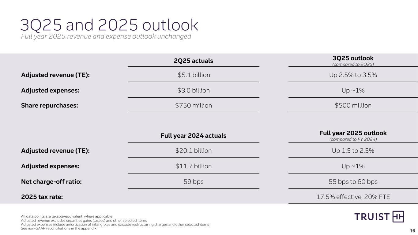 15 11.6% 11.3% 11.0% 2Q24 1Q25 2Q25 9.6% 9.6% 9.3% 2Q24 1Q25 2Q25 9.9% Capital Capital actions and commentary $0.6 $0.6 CET1 ratio CET1 ratio (including AOCI)1 Current quarter regulatory capital information is preliminary 1 Includes the impact of AOCI related to securities and pension, as well as related changes to deferred tax Well positioned to grow and return capital to shareholders 7.0% min. req. effective 10/1/25 – CET1 ratio decreased 30 bps vs. 3/31/25 as capital returned to shareholders and an increase in RWA were partially offset by current quarter earnings – Returned $1.4 billion of capital to shareholders in 2Q25 through our common stock dividend and $750 million of share repurchases – Achieved favorable CCAR results – CET1 erosion rate declined 90 bps driven by a 50 bps decline in total loan loss rate from prior year – SCB expected to improve and be floored at 2.5% effective 10/1/25; a 30 bps reduction from prior year