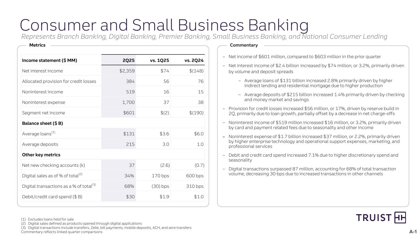 A-1 – Net income of $601 million, compared to $603 million in the prior quarter – Net interest income of $2.4 billion increased by $74 million, or 3.2%, primarily driven by volume and deposit spreads – Average loans of $131 billion increased 2.8% primarily driven by higher indirect lending and residential mortgage due to higher production – Average deposits of $215 billion increased 1.4% primarily driven by checking and money market and savings – Provision for credit losses increased $56 million, or 17%, driven by reserve build in 2Q, primarily due to loan growth, partially offset by a decrease in net charge-offs – Noninterest income of $519 million increased $16 million, or 3.2%, primarily driven by card and payment related fees due to seasonality and other income – Noninterest expense of $1.7 billion increased $37 million, or 2.2%, primarily driven by higher enterprise technology and operational support expenses, marketing, and professional services – Debit and credit card spend increased 7.1% due to higher discretionary spend and seasonality – Digital transactions surpassed 87 million, accounting for 68% of total transaction volume, decreasing 30 bps due to increased transactions in other channels Consumer and Small Business Banking (1) Excludes loans held for sale (2) Digital sales defined as products opened through digital applications (3) Digital transactions include transfers, Zelle, bill payments, mobile deposits, ACH, and wire transfers Commentary reflects linked quarter comparisons Metrics Commentary Income statement ($ MM) 2Q25 vs. 1Q25 vs. 2Q24 Net interest income $2,359 $74 $(148) Allocated provision for credit losses 384 56 76 Noninterest income 519 16 15 Noninterest expense 1,700 37 38 Segment net income $601 $(2) $(190) Balance sheet ($ B) Average loans(1) $131 $3.6 $6.0 Average deposits 215 3.0 1.0 Other key metrics Net new checking accounts (k) 37 (2.6) (0.7) Digital sales as of % of total(2) 34% 170 bps 600 bps Digital transactions as a % of total(3) 68% (30) bps 310 bps Debit/credit card spend ($ B) $30 $1.9 $1.0 Represents Branch Banking, Digital Banking, Premier Banking, Small Business Banking, and National Consumer Lending