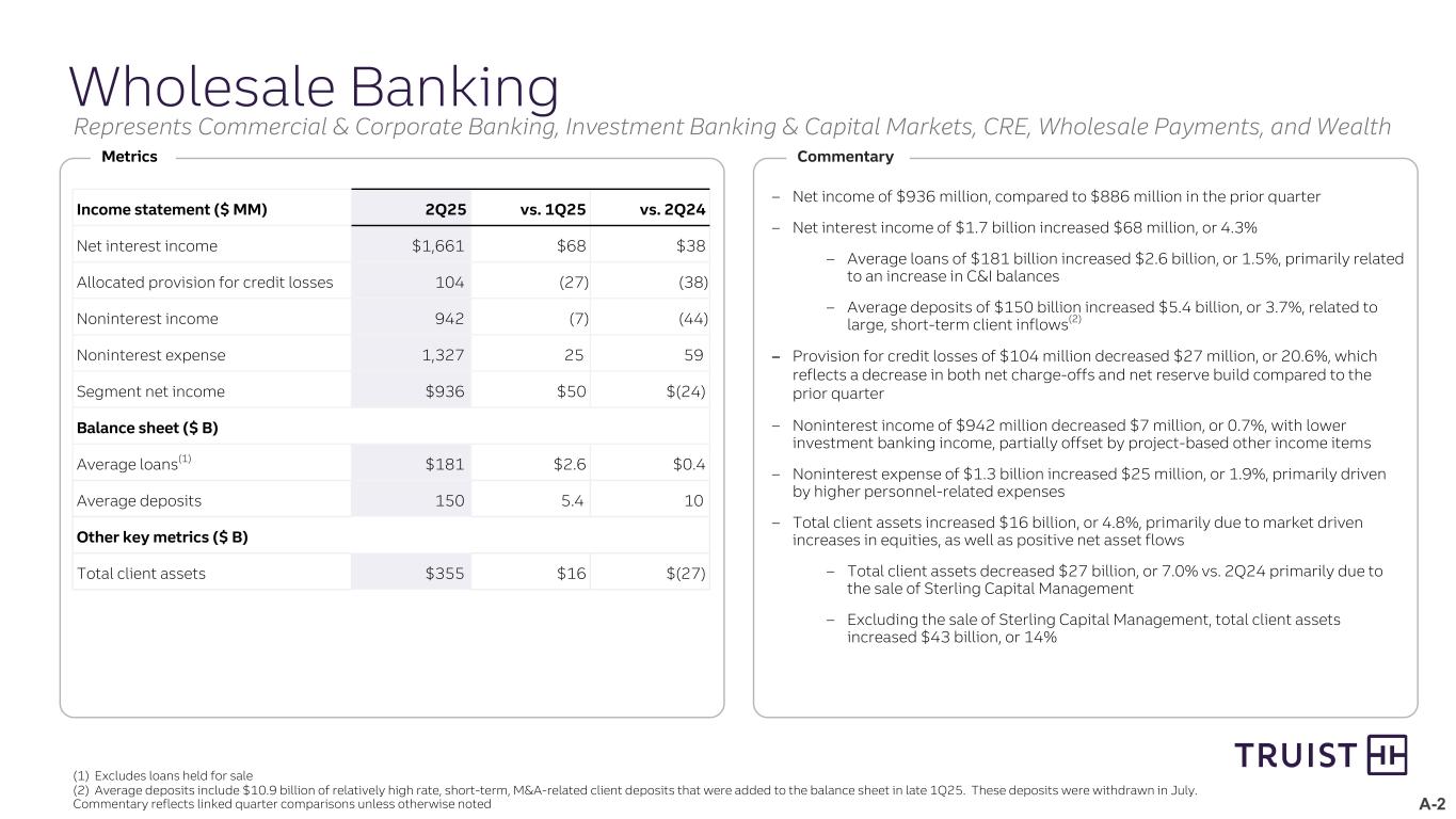A-2 Wholesale Banking (1) Excludes loans held for sale (2) Average deposits include $10.9 billion of relatively high rate, short-term, M&A-related client deposits that were added to the balance sheet in late 1Q25. These deposits were withdrawn in July. Commentary reflects linked quarter comparisons unless otherwise noted – Net income of $936 million, compared to $886 million in the prior quarter – Net interest income of $1.7 billion increased $68 million, or 4.3% – Average loans of $181 billion increased $2.6 billion, or 1.5%, primarily related to an increase in C&I balances – Average deposits of $150 billion increased $5.4 billion, or 3.7%, related to large, short-term client inflows(2) – Provision for credit losses of $104 million decreased $27 million, or 20.6%, which reflects a decrease in both net charge-offs and net reserve build compared to the prior quarter – Noninterest income of $942 million decreased $7 million, or 0.7%, with lower investment banking income, partially offset by project-based other income items – Noninterest expense of $1.3 billion increased $25 million, or 1.9%, primarily driven by higher personnel-related expenses – Total client assets increased $16 billion, or 4.8%, primarily due to market driven increases in equities, as well as positive net asset flows – Total client assets decreased $27 billion, or 7.0% vs. 2Q24 primarily due to the sale of Sterling Capital Management – Excluding the sale of Sterling Capital Management, total client assets increased $43 billion, or 14% Metrics Commentary Income statement ($ MM) 2Q25 vs. 1Q25 vs. 2Q24 Net interest income $1,661 $68 $38 Allocated provision for credit losses 104 (27) (38) Noninterest income 942 (7) (44) Noninterest expense 1,327 25 59 Segment net income $936 $50 $(24) Balance sheet ($ B) Average loans(1) $181 $2.6 $0.4 Average deposits 150 5.4 10 Other key metrics ($ B) Total client assets $355 $16 $(27) Represents Commercial & Corporate Banking, Investment Banking & Capital Markets, CRE, Wholesale Payments, and Wealth
