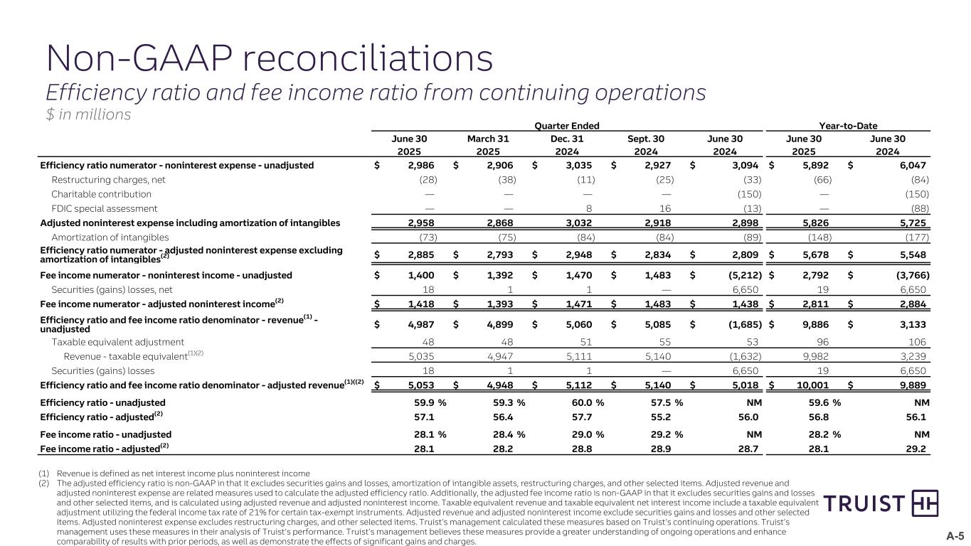 A-5 Non-GAAP reconciliations Efficiency ratio and fee income ratio from continuing operations $ in millions (1) Revenue is defined as net interest income plus noninterest income (2) The adjusted efficiency ratio is non-GAAP in that it excludes securities gains and losses, amortization of intangible assets, restructuring charges, and other selected items. Adjusted revenue and adjusted noninterest expense are related measures used to calculate the adjusted efficiency ratio. Additionally, the adjusted fee income ratio is non-GAAP in that it excludes securities gains and losses and other selected items, and is calculated using adjusted revenue and adjusted noninterest income. Taxable equivalent revenue and taxable equivalent net interest income include a taxable equivalent adjustment utilizing the federal income tax rate of 21% for certain tax-exempt instruments. Adjusted revenue and adjusted noninterest income exclude securities gains and losses and other selected items. Adjusted noninterest expense excludes restructuring charges, and other selected items. Truist’s management calculated these measures based on Truist’s continuing operations. Truist’s management uses these measures in their analysis of Truist’s performance. Truist’s management believes these measures provide a greater understanding of ongoing operations and enhance comparability of results with prior periods, as well as demonstrate the effects of significant gains and charges.   Quarter Ended Year-to-Date   June 30 March 31 Dec. 31 Sept. 30 June 30 June 30 June 30 2025 2025 2024 2024 2024 2025 2024 Efficiency ratio numerator - noninterest expense - unadjusted $ 2,986 $ 2,906 $ 3,035 $ 2,927 $ 3,094 $ 5,892 $ 6,047 Restructuring charges, net (28) (38) (11) (25) (33) (66) (84) Charitable contribution — — — — (150) — (150) FDIC special assessment — — 8 16 (13) — (88) Adjusted noninterest expense including amortization of intangibles 2,958 2,868 3,032 2,918 2,898 5,826 5,725 Amortization of intangibles (73) (75) (84) (84) (89) (148) (177) Efficiency ratio numerator - adjusted noninterest expense excluding amortization of intangibles(2) $ 2,885 $ 2,793 $ 2,948 $ 2,834 $ 2,809 $ 5,678 $ 5,548 Fee income numerator - noninterest income - unadjusted $ 1,400 $ 1,392 $ 1,470 $ 1,483 $ (5,212) $ 2,792 $ (3,766) Securities (gains) losses, net 18 1 1 — 6,650 19 6,650 Fee income numerator - adjusted noninterest income(2) $ 1,418 $ 1,393 $ 1,471 $ 1,483 $ 1,438 $ 2,811 $ 2,884 Efficiency ratio and fee income ratio denominator - revenue(1) - unadjusted $ 4,987 $ 4,899 $ 5,060 $ 5,085 $ (1,685) $ 9,886 $ 3,133 Taxable equivalent adjustment 48 48 51 55 53 96 106 Revenue - taxable equivalent(1)(2) 5,035 4,947 5,111 5,140 (1,632) 9,982 3,239 Securities (gains) losses 18 1 1 — 6,650 19 6,650 Efficiency ratio and fee income ratio denominator - adjusted revenue(1)((2) $ 5,053 $ 4,948 $ 5,112 $ 5,140 $ 5,018 $ 10,001 $ 9,889 Efficiency ratio - unadjusted 59.9 % 59.3 % 60.0 % 57.5 % NM 59.6 % NM Efficiency ratio - adjusted(2) 57.1 56.4 57.7 55.2 56.0 56.8 56.1 Fee income ratio - unadjusted 28.1 % 28.4 % 29.0 % 29.2 % NM 28.2 % NM Fee income ratio - adjusted(2) 28.1 28.2 28.8 28.9 28.7 28.1 29.2