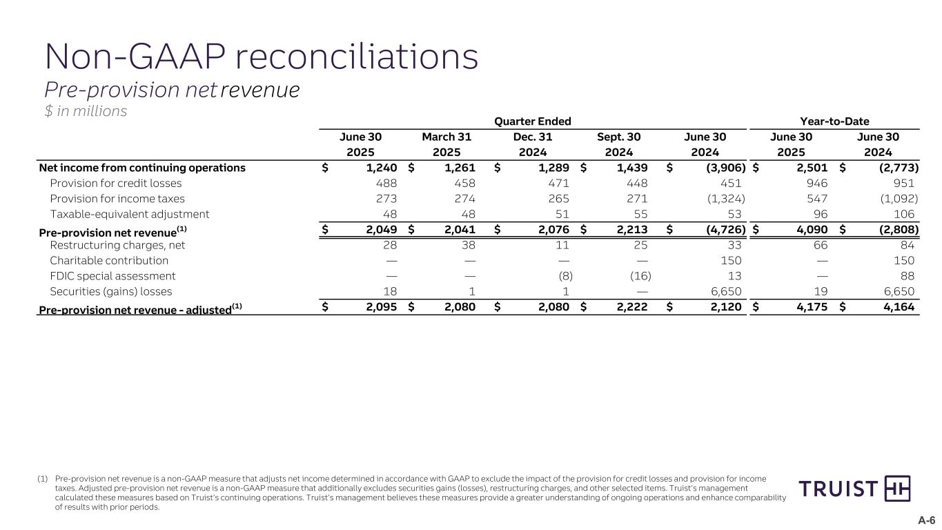 A-6 Non-GAAP reconciliations Pre-provision net revenue $ in millions (1) Pre-provision net revenue is a non-GAAP measure that adjusts net income determined in accordance with GAAP to exclude the impact of the provision for credit losses and provision for income taxes. Adjusted pre-provision net revenue is a non-GAAP measure that additionally excludes securities gains (losses), restructuring charges, and other selected items. Truist’s management calculated these measures based on Truist’s continuing operations. Truist’s management believes these measures provide a greater understanding of ongoing operations and enhance comparability of results with prior periods.   Quarter Ended Year-to-Date   June 30 March 31 Dec. 31 Sept. 30 June 30 June 30 June 30 2025 2025 2024 2024 2024 2025 2024 Net income from continuing operations $ 1,240 $ 1,261 $ 1,289 $ 1,439 $ (3,906) $ 2,501 $ (2,773) Provision for credit losses 488 458 471 448 451 946 951 Provision for income taxes 273 274 265 271 (1,324) 547 (1,092) Taxable-equivalent adjustment 48 48 51 55 53 96 106 Pre-provision net revenue(1) $ 2,049 $ 2,041 $ 2,076 $ 2,213 $ (4,726) $ 4,090 $ (2,808) Restructuring charges, net 28 38 11 25 33 66 84 Charitable contribution — — — — 150 — 150 FDIC special assessment — — (8) (16) 13 — 88 Securities (gains) losses 18 1 1 — 6,650 19 6,650 Pre-provision net revenue - adjusted(1) $ 2,095 $ 2,080 $ 2,080 $ 2,222 $ 2,120 $ 4,175 $ 4,164