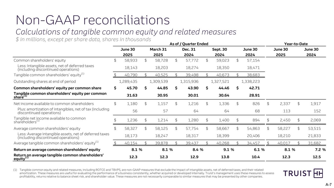 A-7 Non-GAAP reconciliations Calculations of tangible common equity and related measures $ in millions, except per share data, shares in thousands (1) Tangible common equity and related measures, including ROTCE and TBVPS, are non-GAAP measures that exclude the impact of intangible assets, net of deferred taxes, and their related amortization. These measures are useful for evaluating the performance of a business consistently, whether acquired or developed internally. Truist’s management uses these measures to assess profitability, returns relative to balance sheet risk, and shareholder value. These measures are not necessarily comparable to similar measures that may be presented by other companies.   As of / Quarter Ended Year-to-Date   June 30 March 31 Dec. 31 Sept. 30 June 30 June 30 June 30   2025 2025 2024 2024 2024 2025 2024 Common shareholders’ equity $ 58,933 $ 58,728 $ 57,772 $ 59,023 $ 57,154 Less: Intangible assets, net of deferred taxes (including discontinued operations) 18,143 18,203 18,274 18,350 18,471 Tangible common shareholders’ equity(1) $ 40,790 $ 40,525 $ 39,498 $ 40,673 $ 38,683 Outstanding shares at end of period 1,289,435 1,309,539 1,315,936 1,327,521 1,338,223 Common shareholders’ equity per common share $ 45.70 $ 44.85 $ 43.90 $ 44.46 $ 42.71 Tangible common shareholders’ equity per common share(1) 31.63 30.95 30.01 30.64 28.91 Net income available to common shareholders $ 1,180 $ 1,157 $ 1,216 $ 1,336 $ 826 $ 2,337 $ 1,917 Plus: amortization of intangibles, net of tax (including discontinued operations) 56 57 64 64 68 113 152 Tangible net income available to common shareholders(1) $ 1,236 $ 1,214 $ 1,280 $ 1,400 $ 894 $ 2,450 $ 2,069 Average common shareholders’ equity $ 58,327 $ 58,125 $ 57,754 $ 58,667 $ 54,863 $ 58,227 $ 53,515 Less: Average intangible assets, net of deferred taxes (including discontinued operations) 18,173 18,247 18,317 18,399 20,406 18,210 21,833 Average tangible common shareholders’ equity(1) $ 40,154 $ 39,878 $ 39,437 $ 40,268 $ 34,457 $ 40,017 $ 31,682 Return on average common shareholders’ equity 8.1 % 8.1 % 8.4 % 9.1 % 6.1 % 8.1 % 7.2 % Return on average tangible common shareholders’ equity(1) 12.3 12.3 12.9 13.8 10.4 12.3 12.5