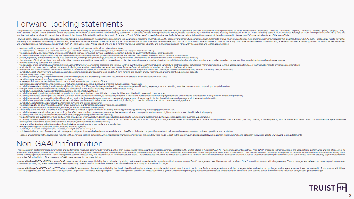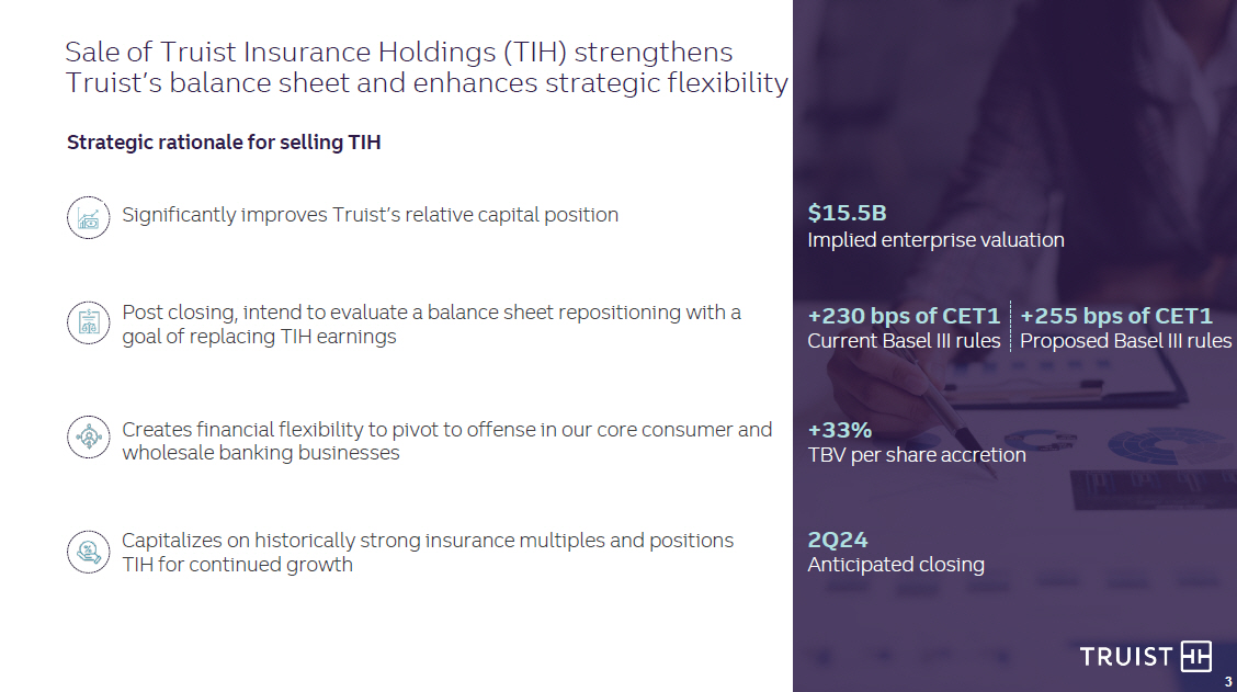 Forward - looking statements 2 This presentation contains “forward - looking statements” within the meaning of the Private Securities Litigation Reform Act of 1995 , regarding the financial condition, results of operations, business plans and the future performance of Truist . Words such as “anticipates,” “believes,” “estimates,” “expects,” “forecasts,” “intends,” “plans,” “projects,” “may,” “will,” “should,” “would,” “could” and other similar expressions are intended to identify these forward - looking statements . In particular, forward looking statements include, but are not limited to, statements we make about : (i) the impact of a sale of Truist’s remaining stake in Truist Insurance Holdings on Truist’s enterprise valuation, CET 1 ratio and tangible book value per share, (ii) the anticipated timing of the closing of the sale, (iii) the financial impact of the sale on Truist, (iv) the use of proceeds from the sale, (v) Truist’s expected capital position as a result of the sale compared to its peers and (vi) expected advantages of the sale to Truist . Forward - looking statements are not based on historical facts but instead represent management’s expectations and assumptions regarding Truist’s business, the economy and other future conditions . Such statements involve inherent uncertainties, risks and changes in circumstances that are difficult to predict . As such, Truist’s actual results may differ materially from those contemplated by forward - looking statements . While there can be no assurance that any list of risks and uncertainties or risk factors is complete, important factors that could cause actual results to differ materially from those contemplated by forward - looking statements include the following, without limitation, as well as the risks and uncertainties more fully discussed under Part I, Item 1 A - Risk Factors in our Annual Report on Form 10 - K for the year ended December 31 , 2022 and in Truist’s subsequent filings with the Securities and Exchange Commission : – current and future economic and market conditions, such as the interest rate environment; U.S. fiscal debt, budget and tax matters; geopolitical matters (including conflicts in the Ukraine, Israel, and the Gaza Strip); and any slowdown in global economic growth could result in, among other things, slower deposit or asset growth, a deterioration in credit quality, or a reduced demand for credit, insurance, or other services; – the monetary and fiscal policies of the federal government and its agencies, including in response to higher inflation, could have a material adverse effect on the economy and Truist’s profitability; – regulatory and supervisory matters, litigation, or other legal actions may result in, among other things, costs, fines, penalties, restrictions on Truist’s business activities, reputational harm, negative publicity, or other adverse consequences; – evolving legislative, accounting, regulatory, and supervisory standards, including with respect to climate change, deposit, capital, liquidity, and long - term debt requirements, which may become more stringent in light of the turmoil in the banking industry in early 2023, and results of regulatory examinations, may adversely affect Truist’s financial condition and results of operations; – increased scrutiny regarding Truist’s consumer sales practices, training practices, incentive compensation design, and governance could damage its reputation and adversely impact business and revenues; – Truist may be impacted by actual or perceived soundness of other financial institutions, including as a result of the financial or operational failure of a major financial institution, or concerns about the creditworthiness of such a financial institution or its ability to fulfill its obligations, which can cause substantial and cascading disruption within the financial markets and increased expenses, including FDIC insurance premiums, and could affect our ability to attract and retain depositors and to borrow or raise capital; – Truist is subject to credit risk by lending or committing to lend money, may have more credit risk and higher credit losses to the extent that loans are concentrated by loan type, industry segment, borrower type or location of the borrower or collateral, and may suffer losses if the value of collateral declines in stressed market conditions; – inability to access short - term funding or liquidity, loss of client deposits, or changes in Truist’s credit ratings could increase the cost of funding, limit access to capital markets, or negatively affect Truist’s overall liquidity or capitalization; – unexpected outflows of uninsured deposits may require Truist to sell investment securities at a loss; – a loss of value of Truist’s investment portfolio could negatively impact market perceptions of Truist and could lead to deposit withdrawals; – risk management oversight functions may not identify or address risks adequately, and management may not be able to effectively manage credit risk; – there are risks resulting from the extensive use of models in Truist’s business, which may impact decisions made by management and regulators; – deposit attrition, client loss, or revenue loss following completed mergers or acquisitions may be greater than anticipated; – Truist could fail to execute on strategic or operational plans, including the ability to achieve its cost savings targets; – increased competition, including from (i) new or existing competitors that could have greater financial resources or be subject to different regulatory standards or compliance costs, and (ii) products and services offered by non - bank financial technology companies, may reduce Truist’s client base, cause Truist to lower prices for its products and services in order to maintain market share or otherwise adversely impact Truist’s businesses or