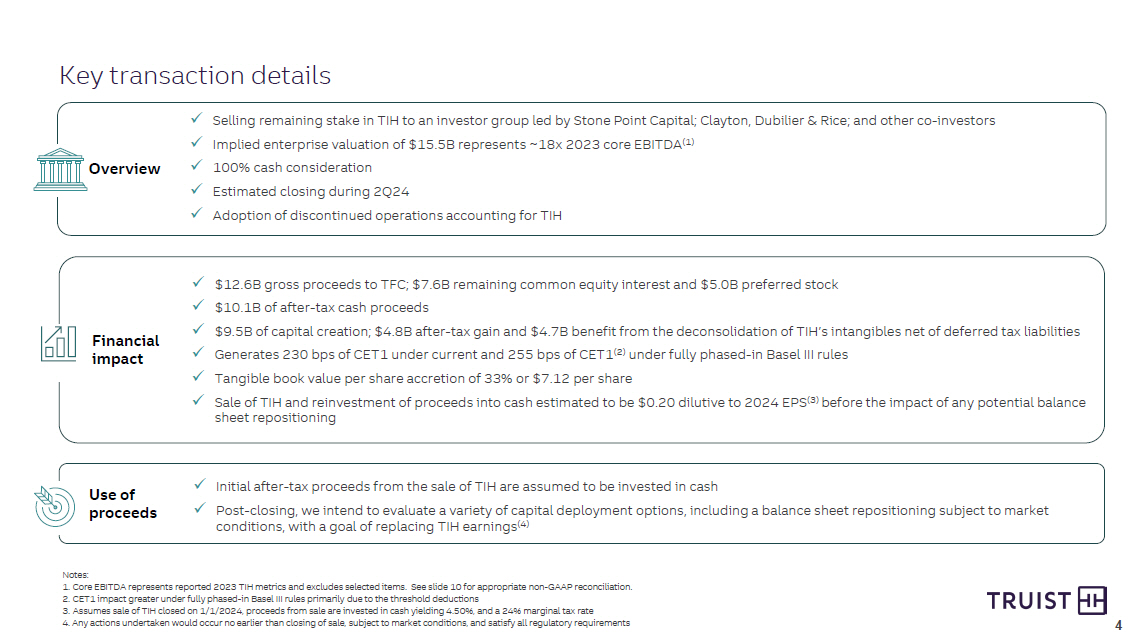 3 Significantly improves Truist’s relative capital position +230 bps of CET1 Current Basel III rules 2Q24 Anticipated closing +33% TBV per share accretion 3 $15.5B Implied enterprise valuation Sale of Truist Insurance Holdings (TIH) strengthens Truist’s balance sheet and enhances strategic flexibility Post closing, intend to evaluate a balance sheet repositioning with a goal of replacing TIH earnings Creates financial flexibility to pivot to offense in our core consumer and wholesale banking businesses Strategic rationale for selling TIH Capitalizes on historically strong insurance multiples and positions TIH for continued growth +255 bps of CET1 Proposed Basel III rules