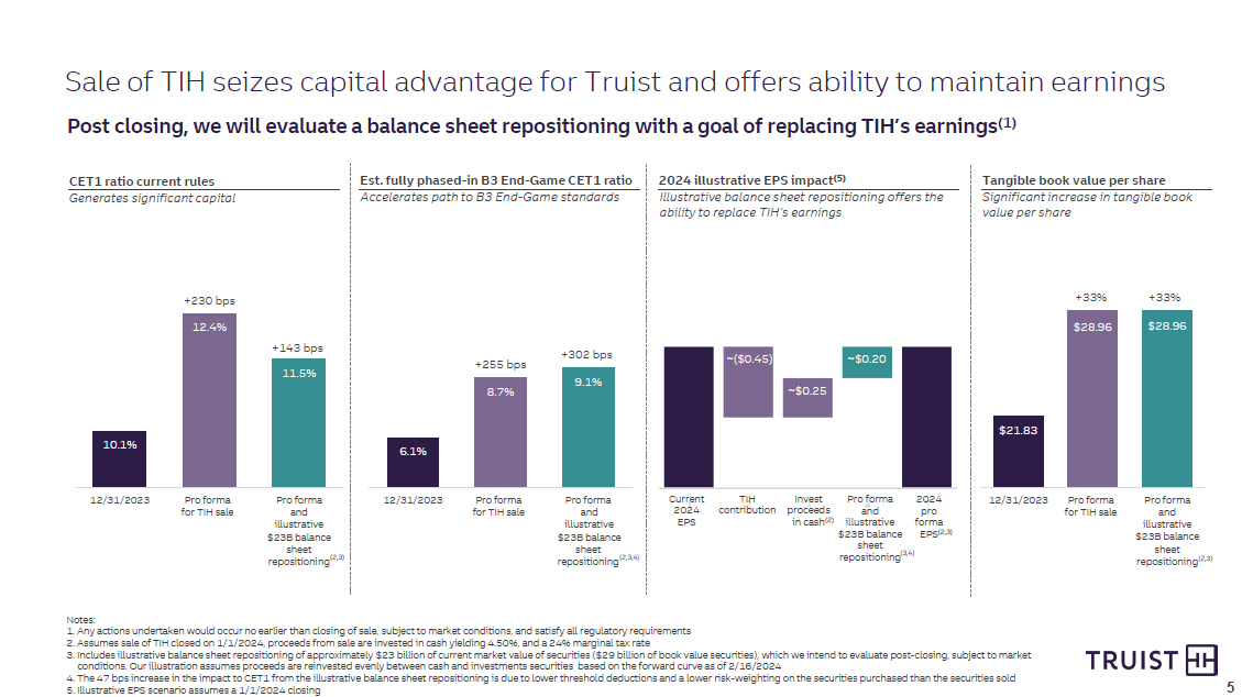 Overview Key transaction details x Selling remaining stake in TIH to an investor group led by Stone Point Capital; Clayton, Dubilier & Rice; and other co - investors x Implied enterprise valuation of $15.5B represents ~18x 2023 core EBITDA (1) x 100% cash consideration x Estimated closing during 2Q24 x Adoption of discontinued operations accounting for TIH Financ ial impact x $12.6B gross proceeds to TFC; $7.6B remaining common equity interest and $5.0B preferred stock x $10.1B of after - tax cash proceeds x $9.5B of capital creation; $4.8B after - tax gain and $4.7B benefit from the deconsolidation of TIH’s intangibles net of deferred tax liabilities x Generates 230 bps of CET1 under current and 255 bps of CET1 (2) under fully phased - in Basel III rules x Tangible book value per share accretion of 33% or $7.12 per share x Sale of TIH and reinvestment of proceeds into cash estimated to be $0.20 dilutive to 2024 EPS (3) before the impact of any potential balance sheet repositioning x Initial after - tax proceeds from the sale of TIH are assumed to be invested in cash x Post - closing, we intend to evaluate a variety of capital deployment options, including a balance sheet repositioning subject to market conditions, with a goal of replacing TIH earnings (4) Notes: 1. Core EBITDA represents reported 2023 TIH metrics and excludes selected items. See slide 10 for appropriate non - GAAP reconciliation. 2. CET1 impact greater under fully phased - in Basel III rules primarily due to the threshold deductions 3. Assumes sale of TIH closed on 1/1/2024, proceeds from sale are invested in cash yielding 4.50%, and a 24% marginal tax rate 4. Any actions undertaken would occur no earlier than closing of sale, subject to market conditions, and satisfy all regulatory requirements 4 Use of proceeds