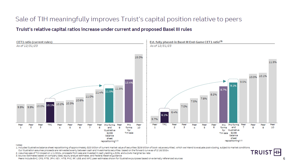 value per share $21.83 $28.96 $28.96 12/31/2023 Pro forma for TIH sale Current TIH 2024 co nt ributi o n EPS proc e eds and $23B balance sheet r e pos i t io n i n g Invest P ro f orma 2024 pro ~($0.45) ~$0.25 ~$0.20 6.1% 8.7% 9.1% 12/31/2023 Pro forma for TIH sale Sale of TIH seizes capital advantage for Truist and offers ability to maintain earnings +255 bps +302 bps (3, 4 ) EPS (2,3) Tangible book value per share Significant increase in tangible book +33% +33% 10.1% 12.4% 11.5% 12/31/2023 Pro forma for TIH sale Pro forma and il l ust rat i v e $23B balance sheet repositioning (2,3) +230 bps +143 bps 5 Post closing, we will evaluate a balance sheet repositioning with a goal of replacing TIH’s earnings (1) CET1 ratio current rules Generates significant capital Est. fully phased - in B3 End - Game CET1 ratio Accelerates path to B3 End - Game standards 2024 illustrative EPS impact (5) Illustrative balance sheet repositioning offers the ability to replace TIH’s earnings Pro forma and ill ustr ati v e $23B balance sheet repositioning (2,3,4) Pro forma and il l ust rat i v e $23B balance sheet repositioning (2,3) in cash (2) illustrative forma Notes: 1. Any actions undertaken would occur no earlier than closing of sale, subject to market conditions, and satisfy all regulatory requirements 2. Assumes sale of TIH closed on 1/1/2024, proceeds from sale are invested in cash yielding 4.50%, and a 24% marginal tax rate 3. Includes illustrative balance sheet repositioning of approximately $23 billion of current market value of securities ($29 billion of book value securities), which we intend to evaluate post - closing, subject to market conditions. Our illustration assumes proceeds are reinvested evenly between cash and investments securities based on the forward curve as of 2/16/2024 4. The 47 bps increase in the impact to CET1 from the illustrative balance sheet repositioning is due to lower threshold deductions and a lower risk - weighting on the securities purchased than the securities sold 5. Illustrative EPS scenario assumes a 1/1/2024 closing