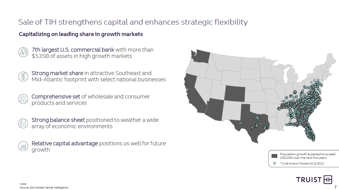 5.7% 6.1% 6.4% 7.0% 7.5% 7.8% 8.2% 8.7% 9.1% 9.5% 10.0% 10.1% 11.5% Sale of TIH meaningfully improves Truist’s capital position relative to peers 6 Notes: 1. Includes illustrative balance sheet repositioning of approximately $23 billion of current market value of securities ($29 billion of book value securities), which we intend to evaluate post - closing, subject to market conditions. Our illustration assumes proceeds are reinvested evenly between cash and investments securities based on the forward curve as of 2/16/2024 2. Assumes sale of TIH closed on 1/1/2024, proceeds from sale are invested in cash yielding 4.50%, and a 24% marginal tax rate 3. Source: Estimates based on company data, equity analyst estimates, and Federal Reserve guidance Peers include BAC, CFG, FITB, JPM, KEY, MTB, PNC, RF, USB, and WFC; peer estimates shown for illustrative purposes based on externally referenced sources illu str ative $23B balance sheet r e pos i t io n i n g ( 1 , 2 ) Peer 1 TFC Peer 2 Peer 3 Peer 4 Pee r Peer 5 6 and 7 P ro f or ma Pee r P e e r 8 Pro f orma for TIH sale 9.9% 9.9% 10.0% 10.1% 10.2% 10.3% 10.6% 11.0% 11.4% 11.5% 11.8% 12.4% 15.0% P e e r 1 TFC P e e r P e e r 2 3 P e e r 4 P e e r 5 P e e r 6 P e e r 7 Pro f orma for TIH sale and illu str ative $23B balance sheet r e pos i t io n i n g ( 1 , 2 ) Est. fully phased - in Basel III End - Game CET1 ratio (3) Peer Pro forma Peer 8 9 P e e r 10 P ee r 9 P e e r 10 Truist’s relative capital ratios increase under current and proposed Basel III rules CET1 ratio (current rules) As of 12/31/23 As of 12/31/23