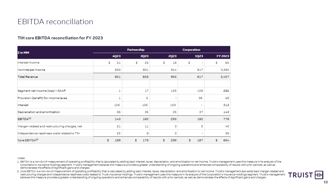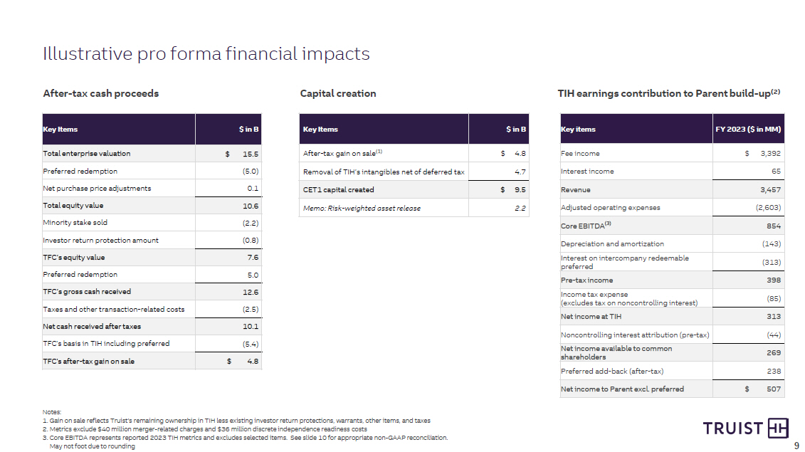 Illustrative pro forma financial impacts After - tax cash proceeds Capital creation TIH earnings contribution to Parent build - up (2) 9 Key Items $ in B Total enterprise valuation $ 15 .5 Preferred redemption (5.0) Net purchase price adjustments 0.1 Total equity value 10.6 Minority stake sold (2.2) Investor return protection amount (0.8) TFC’s equity value 7.6 Preferred redemption 5.0 TFC’s gross cash received 12.6 Taxes and other transaction - related costs (2.5) Net cash received after taxes 10.1 TFC's basis in TIH including preferred (5.4) TFC's after - tax gain on sale $ 4 .8 Key Items $ in B After - tax gain on sale (1) $ 4.8 Removal of TIH’s intangibles net of deferred tax 4.7 CET1 capital created $ 9 .5 Memo: Risk - weighted asset release 2.2 Key items FY 2023 ($ in MM) Fee income $ 3,392 Interest income 65 Revenue 3,457 Adjusted operating expenses (2,603) Core EBITDA (3) 854 Depreciation and amortization (143) Interest on intercompany redeemable preferred ( 3 1 3) Pre - tax income 398 Income tax expense (excludes tax on noncontrolling interest) (85) Net income at TIH 313 Noncontrolling interest attribution (pre - tax) ( 4 4 ) Net income available to common shareholders 26 9 Preferred add - back (after - tax) 238 Net income to Parent excl. preferred $ 50 7 Notes: 1. Gain on sale reflects Truist’s remaining ownership in TIH less existing investor return protections, warrants, other items, and taxes 2. Metrics exclude $40 million merger - related charges and $36 million discrete independence readiness costs 3. Core EBITDA represents reported 2023 TIH metrics and excludes selected items. See slide 10 for appropriate non - GAAP reconciliation. May not foot due to rounding