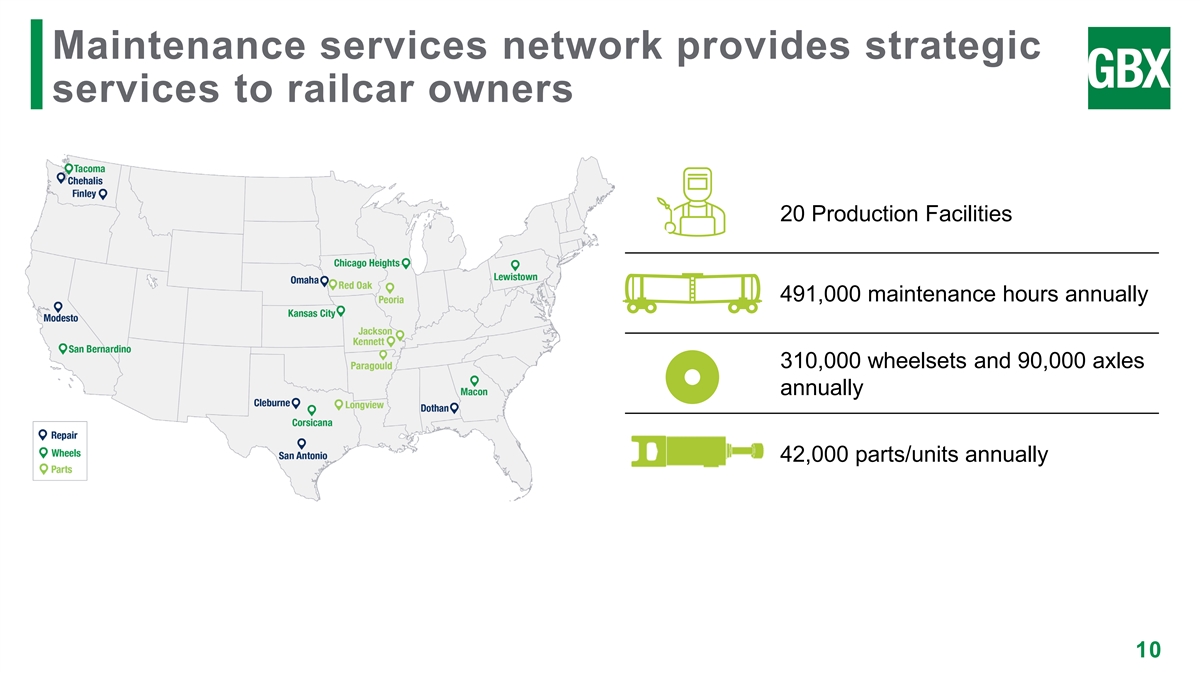 Maintenance services network provides strategic services to railcar owners 20 Production Facilities 491,000 maintenance hours annually 310,000 wheelsets and 90,000 axles annually 42,000 parts/units annually 10