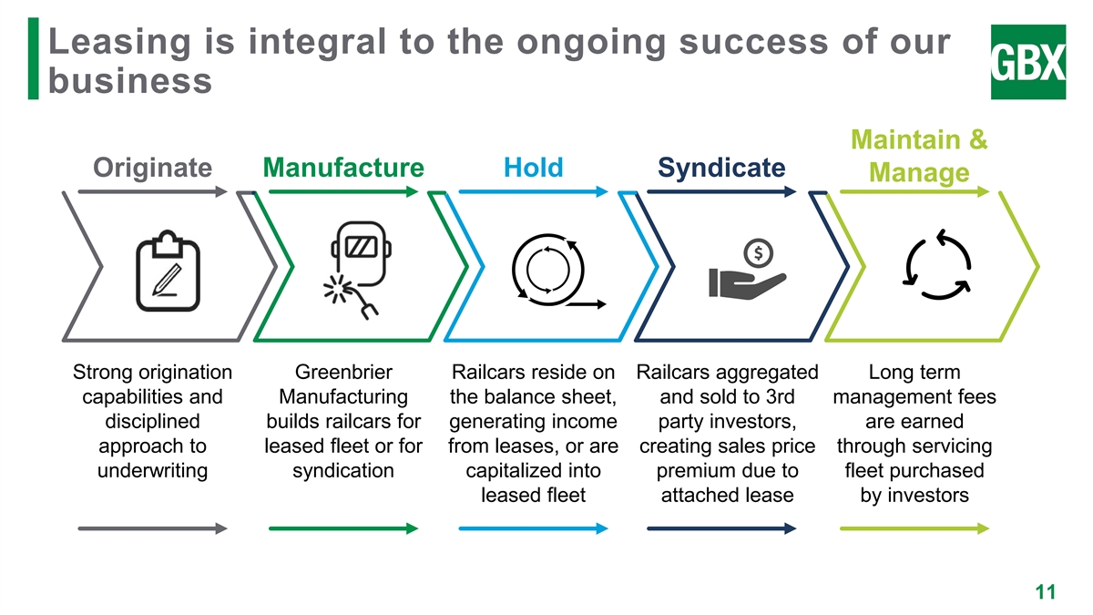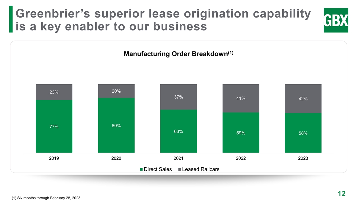 Leasing is integral to the ongoing success of our business Maintain & Originate Manufacture Hold Syndicate Manage Strong origination Greenbrier Railcars reside on Railcars aggregated Long term capabilities and Manufacturing the balance sheet, and sold to 3rd management fees disciplined builds railcars for generating income party investors, are earned approach to leased fleet or for from leases, or are creating sales price through servicing underwriting syndication capitalized into premium due to fleet purchased leased fleet attached lease by investors 11