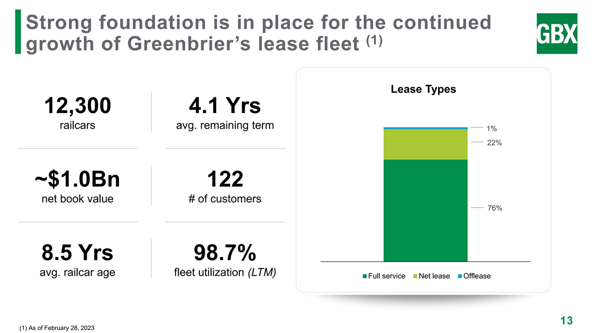 Greenbrier’s superior lease origination capability is a key enabler to our business (1) Manufacturing Order Breakdown 20% 23% 37% 41% 42% 80% 77% 63% 59% 58% 2019 2020 2021 2022 2023 Direct Sales Leased Railcars 12 (1) Six months through February 28, 2023