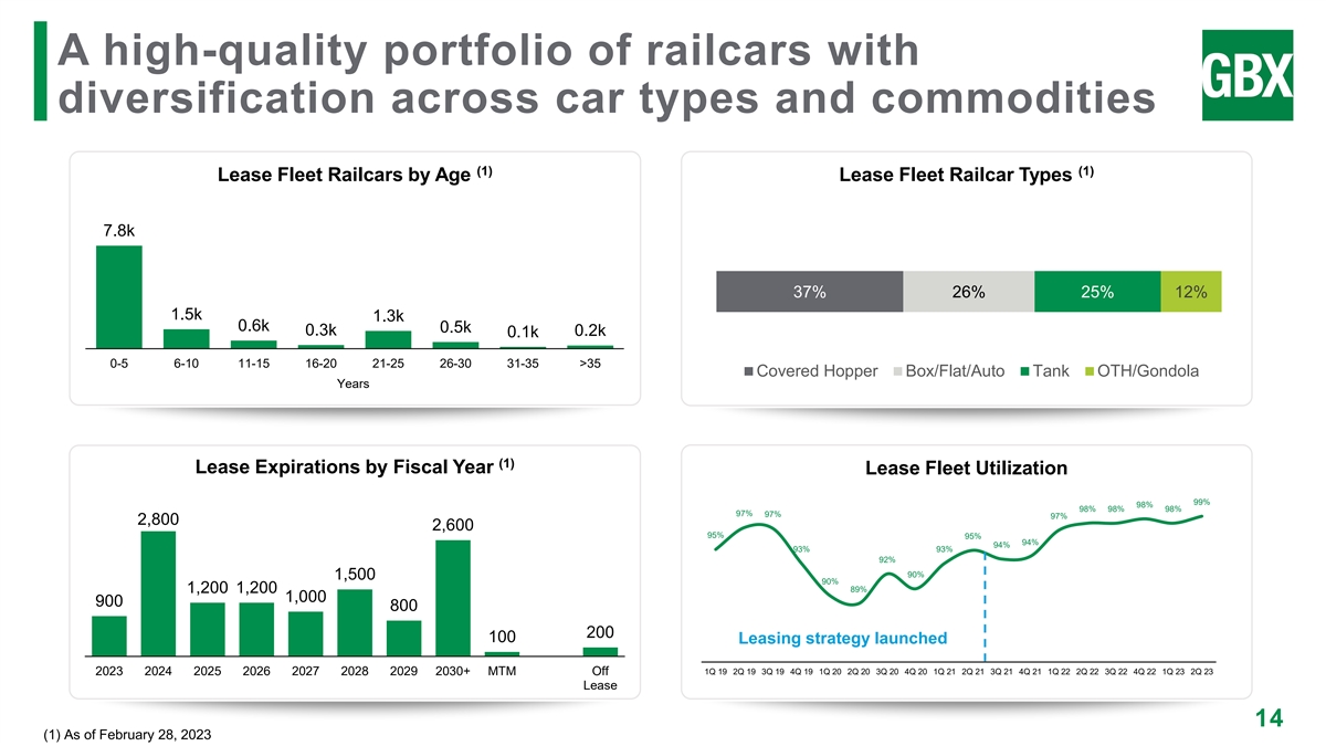 Strong foundation is in place for the continued (1) growth of Greenbrier’s lease fleet Lease Types 12,300 4.1 Yrs railcars avg. remaining term 1% 22% ~$1.0Bn 122 net book value # of customers 76% 8.5 Yrs 98.7% avg. railcar age fleet utilization (LTM) Full service Net lease Offlease 13 (1) As of February 28, 2023