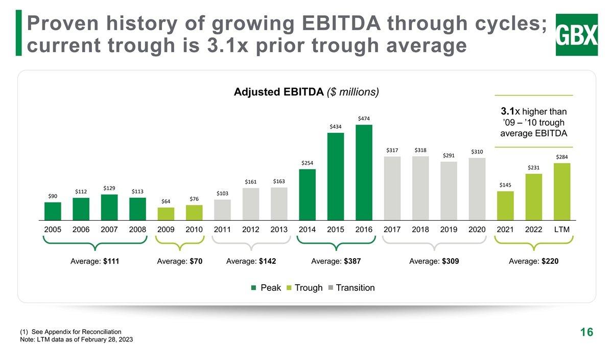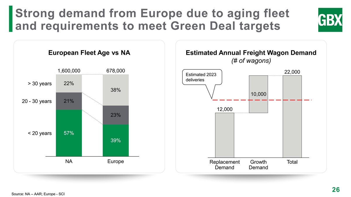 Railcar backlog has historically provided strong visibility into capacity requirements Greenbrier New Railcar Backlog $5.0 $160 $4.5 $160 $4.7 $4.0 $160 $3.5 $159 $3.5 $3.0 $3.3 $3.3 $3.2 $3.1 $2.5 $159 $2.8 $2.8 $2.7 $2.0 $2.4 $159 $1.5 $159 $1.5 $1.0 $1.2 $159 $0.5 $0.0 $158 2012 2013 2014 2015 2016 2017 2018 2019 2020 2021 2022 2Q23 Backlog Value ($ billions) Units in Backlog 10,700 14,400 31,500 41,300 27,500 28,600 27,400 30,300 24,600 26,600 29,500 25,900 17