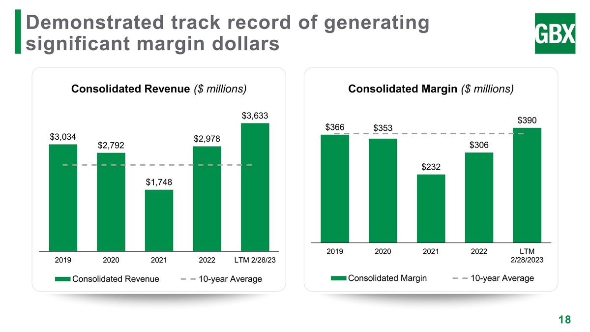 Forward Looking Statements & Non-GAAP Financial Measures This presentation and the accompanying oral presentation contain forward-looking statements, including statements that are not purely statements of historical fact. The Greenbrier Companies, Inc. (the “Company,” “we,” “us” or “our”) uses words, and variations of words, such as “approach,” “believe,” “change,” “create,” “commitment,” “continue,” “demand,” “drive,” “enhance,” “evolve,” “expect,” “focus,” “foundation,” “goal,” “grow,” “help,” “identify,” “invest,” “maintain,” “provide,” “position,” “potential,” “reduce,” “should,” “strategic,” “strengthen,” “superior,” “target,” “trend,” “will,” and similar expressions to identify forward-looking statements. These forward-looking statements include, without limitation, statements about backlog and other orders, production capacity, railcar deliveries, leasing operations and performance, expectations for operating segments, environmental, social and governance commitments, financing, future liquidity, revenue, cash flow, strategic initiatives, partnerships, tax treatment, and other information regarding future performance and strategies and appear throughout this presentation. These forward- looking statements are not guarantees of future performance and are subject to certain risks, uncertainties and important factors that could cause actual results to differ materially from the results contemplated by the forward-looking statements. Such risks, uncertainties and important factors that might cause such a difference include, but are not limited to, the following: an economic downturn and economic uncertainty; inflation (including rising energy prices, interest rates, wages and other escalators) and policy reactions thereto (including actions by central banks); disruptions in the supply of materials and components used in the production of our products; the war in Ukraine and related events, and the COVID-19 pandemic, variants thereof, governmental reaction thereto, and related economic disruptions (including, among other factors, operations and supply disruptions and labor shortages). Our backlog of railcar units and other orders not included in backlog are not necessarily indicative of future results of operations. Certain orders in backlog are subject to customary documentation which may not occur. There may be other factors that may cause our actual results to differ materially from the forward-looking statements, including the risks, uncertainties and factors described in more detail in the Company’s filings with the SEC, including in the “Risk Factors” and “Management’s Discussion and Analysis of Financial Condition and Results of Operations” sections of the Company’s most recently filed Annual Report on Form 10-K and subsequent Quarterly Reports on Form 10-Q. Except as otherwise required by law, the Company assumes no obligation to update any forward-looking statements or information, which speak as of their respective dates. Readers are cautioned not to place undue reliance on these forward-looking statements, which reflect management’s opinions only as of the date hereof. This presentation includes certain financial measures that were not prepared in accordance with generally accepted accounting principles (GAAP) because we believe they help investors understand our performance. Adjusted EBITDA and Adjusted diluted earnings per share (EPS) are not financial measures under GAAP. These metrics are performance measurement tools used by rail supply companies and Greenbrier. You should not consider these metrics in isolation or as a substitute for other financial statement data determined in accordance with GAAP. In addition, because these metrics are not a measure of financial performance under GAAP and are susceptible to varying calculations, the measures presented may differ from and may not be comparable to similarly titled measures used by other companies. We define Adjusted EBITDA as Net earnings (loss) before Interest and foreign exchange, Income tax benefit (expense), Depreciation and amortization and the impact associated with items we do not believe are indicative of our core business or which affect comparability. We believe the presentation of Adjusted EBITDA provides useful information as it excludes the impact of financing, foreign exchange, income taxes and the accounting effects of capital spending and other items. These items may vary for different companies for reasons unrelated to the overall operating performance of a company’s core business. We believe this assists in comparing our performance across reporting periods. Reconciliations of GAAP financial measures to Non-GAAP financial measures are contained in this presentation and on our 2 website at gbrx.com under “Investors”.