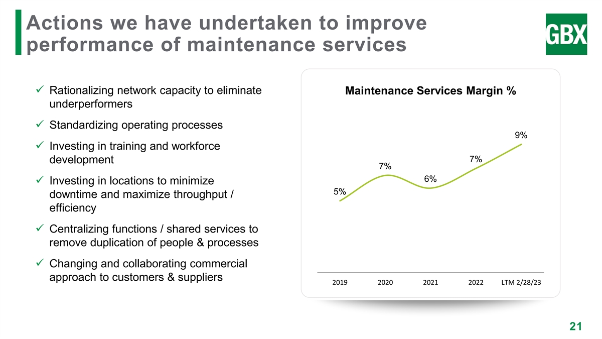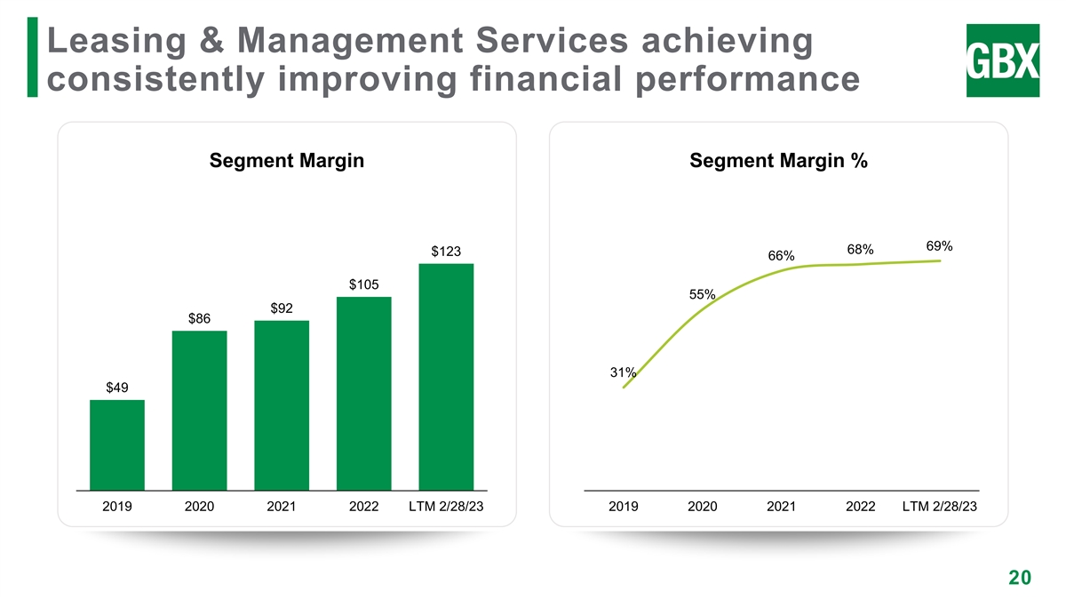 Leasing & Management Services achieving consistently improving financial performance Segment Margin Segment Margin % 69% 68% $123 66% $105 55% $92 $86 31% $49 2019 2020 2021 2022 LTM 2/28/23 2019 2020 2021 2022 LTM 2/28/23 20