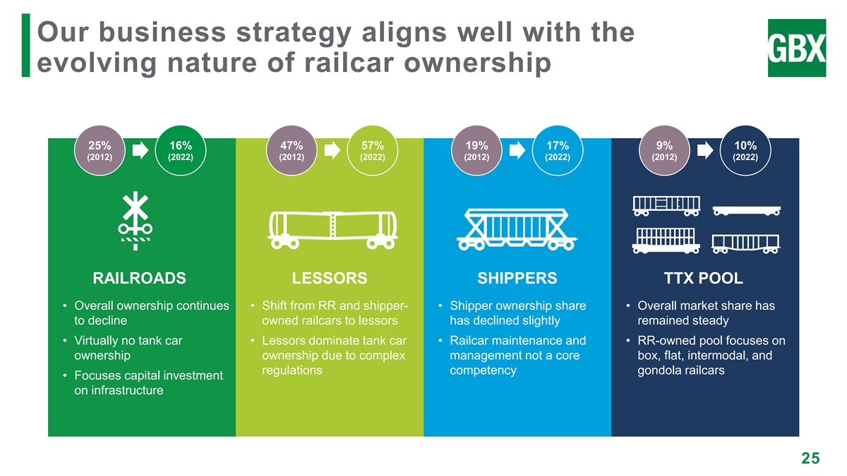 Our business strategy aligns well with the evolving nature of railcar ownership 25% 16% 47% 57% 19% 17% 9% 10% (2012) (2022) (2012) (2022) (2012) (2022) (2012) (2022) RAILROADS LESSORS SHIPPERS TTX POOL • Overall ownership continues • Shift from RR and shipper- • Shipper ownership share • Overall market share has to decline owned railcars to lessors has declined slightly remained steady • Virtually no tank car • Lessors dominate tank car • Railcar maintenance and • RR-owned pool focuses on ownership ownership due to complex management not a core box, flat, intermodal, and regulations competency gondola railcars • Focuses capital investment on infrastructure 25