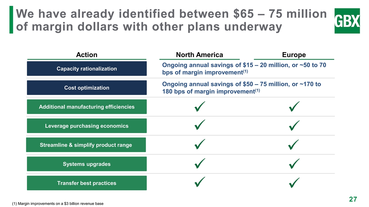 We have already identified between $65 – 75 million of margin dollars with other plans underway Action North America Europe Ongoing annual savings of $15 – 20 million, or ~50 to 70 Capacity rationalization (1) bps of margin improvement Ongoing annual savings of $50 – 75 million, or ~170 to Cost optimization (1) 180 bps of margin improvement Additional manufacturing efficiencies Leverage purchasing economics Streamline & simplify product range Systems upgrades Transfer best practices 27 (1) Margin improvements on a $3 billion revenue base