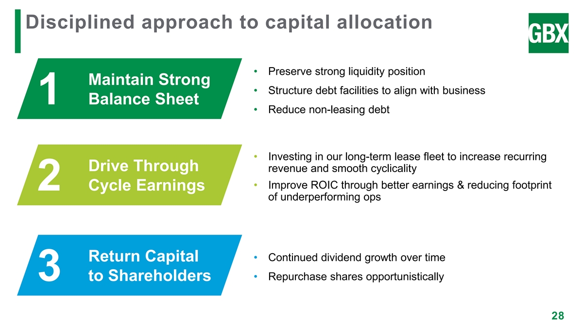 Forward Looking Statements & Non-GAAP Financial Measures This presentation and the accompanying oral presentation contain forward-looking statements, including statements that are not purely statements of historical fact. The Greenbrier Companies, Inc. (the “Company,” “we,” “us” or “our”) uses words, and variations of words, such as “approach,” “believe,” “change,” “create,” “commitment,” “continue,” “demand,” “drive,” “enhance,” “evolve,” “expect,” “focus,” “foundation,” “goal,” “grow,” “help,” “identify,” “invest,” “maintain,” “provide,” “position,” “potential,” “reduce,” “should,” “strategic,” “strengthen,” “superior,” “target,” “trend,” “will,” and similar expressions to identify forward-looking statements. These forward-looking statements include, without limitation, statements about backlog and other orders, production capacity, railcar deliveries, leasing operations and performance, expectations for operating segments, environmental, social and governance commitments, financing, future liquidity, revenue, cash flow, strategic initiatives, partnerships, tax treatment, and other information regarding future performance and strategies and appear throughout this presentation. These forward- looking statements are not guarantees of future performance and are subject to certain risks, uncertainties and important factors that could cause actual results to differ materially from the results contemplated by the forward-looking statements. Such risks, uncertainties and important factors that might cause such a difference include, but are not limited to, the following: an economic downturn and economic uncertainty; inflation (including rising energy prices, interest rates, wages and other escalators) and policy reactions thereto (including actions by central banks); disruptions in the supply of materials and components used in the production of our products; the war in Ukraine and related events, and the COVID-19 pandemic, variants thereof, governmental reaction thereto, and related economic disruptions (including, among other factors, operations and supply disruptions and labor shortages). Our backlog of railcar units and other orders not included in backlog are not necessarily indicative of future results of operations. Certain orders in backlog are subject to customary documentation which may not occur. There may be other factors that may cause our actual results to differ materially from the forward-looking statements, including the risks, uncertainties and factors described in more detail in the Company’s filings with the SEC, including in the “Risk Factors” and “Management’s Discussion and Analysis of Financial Condition and Results of Operations” sections of the Company’s most recently filed Annual Report on Form 10-K and subsequent Quarterly Reports on Form 10-Q. Except as otherwise required by law, the Company assumes no obligation to update any forward-looking statements or information, which speak as of their respective dates. Readers are cautioned not to place undue reliance on these forward-looking statements, which reflect management’s opinions only as of the date hereof. This presentation includes certain financial measures that were not prepared in accordance with generally accepted accounting principles (GAAP) because we believe they help investors understand our performance. Adjusted EBITDA and Adjusted diluted earnings per share (EPS) are not financial measures under GAAP. These metrics are performance measurement tools used by rail supply companies and Greenbrier. You should not consider these metrics in isolation or as a substitute for other financial statement data determined in accordance with GAAP. In addition, because these metrics are not a measure of financial performance under GAAP and are susceptible to varying calculations, the measures presented may differ from and may not be comparable to similarly titled measures used by other companies. We define Adjusted EBITDA as Net earnings (loss) before Interest and foreign exchange, Income tax benefit (expense), Depreciation and amortization and the impact associated with items we do not believe are indicative of our core business or which affect comparability. We believe the presentation of Adjusted EBITDA provides useful information as it excludes the impact of financing, foreign exchange, income taxes and the accounting effects of capital spending and other items. These items may vary for different companies for reasons unrelated to the overall operating performance of a company’s core business. We believe this assists in comparing our performance across reporting periods. Reconciliations of GAAP financial measures to Non-GAAP financial measures are contained in this presentation and on our 2 website at gbrx.com under “Investors”.