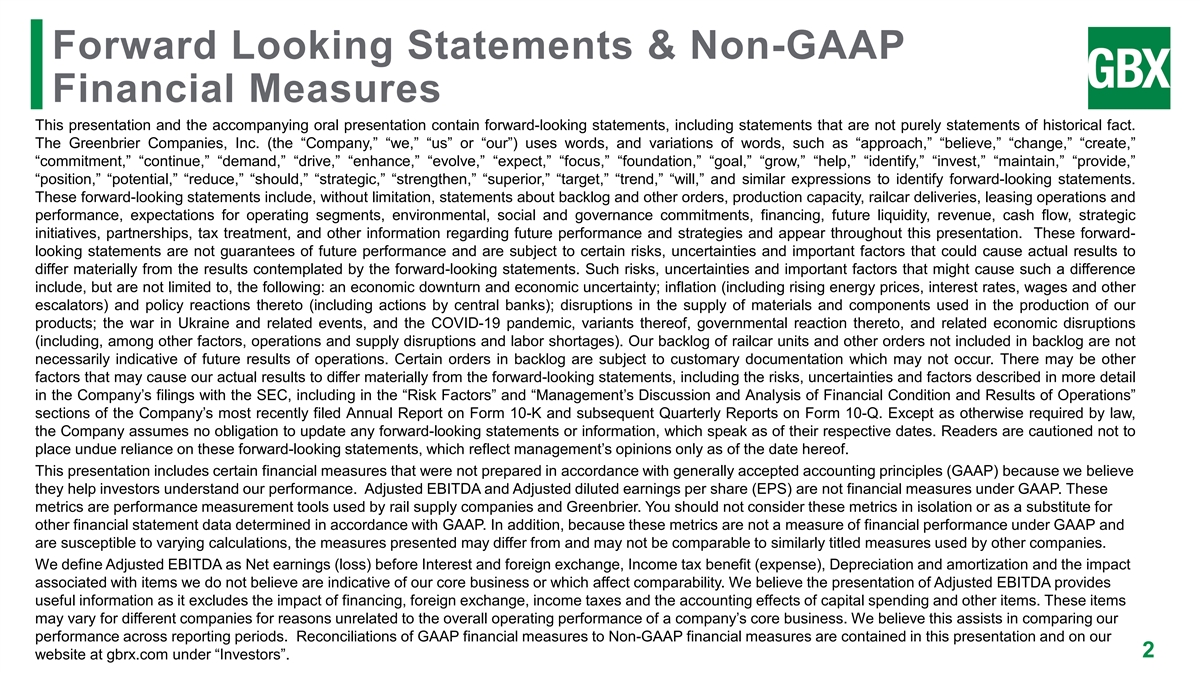 Forward Looking Statements & Non-GAAP Financial Measures This presentation and the accompanying oral presentation contain forward-looking statements, including statements that are not purely statements of historical fact. The Greenbrier Companies, Inc. (the “Company,” “we,” “us” or “our”) uses words, and variations of words, such as “approach,” “believe,” “change,” “create,” “commitment,” “continue,” “demand,” “drive,” “enhance,” “evolve,” “expect,” “focus,” “foundation,” “goal,” “grow,” “help,” “identify,” “invest,” “maintain,” “provide,” “position,” “potential,” “reduce,” “should,” “strategic,” “strengthen,” “superior,” “target,” “trend,” “will,” and similar expressions to identify forward-looking statements. These forward-looking statements include, without limitation, statements about backlog and other orders, production capacity, railcar deliveries, leasing operations and performance, expectations for operating segments, environmental, social and governance commitments, financing, future liquidity, revenue, cash flow, strategic initiatives, partnerships, tax treatment, and other information regarding future performance and strategies and appear throughout this presentation. These forward- looking statements are not guarantees of future performance and are subject to certain risks, uncertainties and important factors that could cause actual results to differ materially from the results contemplated by the forward-looking statements. Such risks, uncertainties and important factors that might cause such a difference include, but are not limited to, the following: an economic downturn and economic uncertainty; inflation (including rising energy prices, interest rates, wages and other escalators) and policy reactions thereto (including actions by central banks); disruptions in the supply of materials and components used in the production of our products; the war in Ukraine and related events, and the COVID-19 pandemic, variants thereof, governmental reaction thereto, and related economic disruptions (including, among other factors, operations and supply disruptions and labor shortages). Our backlog of railcar units and other orders not included in backlog are not necessarily indicative of future results of operations. Certain orders in backlog are subject to customary documentation which may not occur. There may be other factors that may cause our actual results to differ materially from the forward-looking statements, including the risks, uncertainties and factors described in more detail in the Company’s filings with the SEC, including in the “Risk Factors” and “Management’s Discussion and Analysis of Financial Condition and Results of Operations” sections of the Company’s most recently filed Annual Report on Form 10-K and subsequent Quarterly Reports on Form 10-Q. Except as otherwise required by law, the Company assumes no obligation to update any forward-looking statements or information, which speak as of their respective dates. Readers are cautioned not to place undue reliance on these forward-looking statements, which reflect management’s opinions only as of the date hereof. This presentation includes certain financial measures that were not prepared in accordance with generally accepted accounting principles (GAAP) because we believe they help investors understand our performance. Adjusted EBITDA and Adjusted diluted earnings per share (EPS) are not financial measures under GAAP. These metrics are performance measurement tools used by rail supply companies and Greenbrier. You should not consider these metrics in isolation or as a substitute for other financial statement data determined in accordance with GAAP. In addition, because these metrics are not a measure of financial performance under GAAP and are susceptible to varying calculations, the measures presented may differ from and may not be comparable to similarly titled measures used by other companies. We define Adjusted EBITDA as Net earnings (loss) before Interest and foreign exchange, Income tax benefit (expense), Depreciation and amortization and the impact associated with items we do not believe are indicative of our core business or which affect comparability. We believe the presentation of Adjusted EBITDA provides useful information as it excludes the impact of financing, foreign exchange, income taxes and the accounting effects of capital spending and other items. These items may vary for different companies for reasons unrelated to the overall operating performance of a company’s core business. We believe this assists in comparing our performance across reporting periods. Reconciliations of GAAP financial measures to Non-GAAP financial measures are contained in this presentation and on our 2 website at gbrx.com under “Investors”.