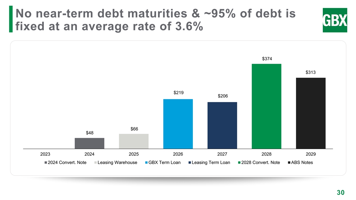 No near-term debt maturities & ~95% of debt is fixed at an average rate of 3.6% $374 $313 $219 $206 $66 $48 2023 2024 2025 2026 2027 2028 2029 2024 Convert. Note Leasing Warehouse GBX Term Loan Leasing Term Loan 2028 Convert. Note ABS Notes 30