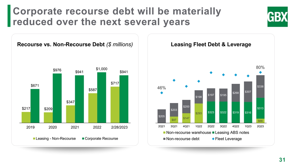 Corporate recourse debt will be materially reduced over the next several years Recourse vs. Non-Recourse Debt ($ millions) Leasing Fleet Debt & Leverage 80% 800,000 85% $1,000 $976 $941 $941 75% 700,000 65% 600,000 $717 $671 $338 55% 46% 500,000 $587 $307 45% $268 $197 $195 400,000 $198 35% $347 300,000 25% $200 $313 $217 200,000 $209 $203 15% $323 $322 $319 $316 $293 100,000 $205 5% $147 $97 $66 - -5% 2Q21 3Q21 4Q21 1Q22 2Q22 3Q22 4Q22 1Q23 2Q23 2019 2020 2021 2022 2/28/2023 Non-recourse warehouse Leasing ABS notes Leasing - Non-Recourse Corporate Recourse Non-recourse debt Fleet Leverage 31