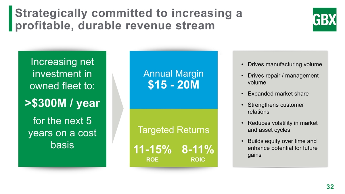Strategically committed to increasing a profitable, durable revenue stream Increasing net • Drives manufacturing volume Annual Margin investment in • Drives repair / management volume $15 - 20M owned fleet to: • Expanded market share • Strengthens customer >$300M / year relations for the next 5 • Reduces volatility in market and asset cycles Targeted Returns years on a cost • Builds equity over time and basis enhance potential for future 11-15% 8-11% gains ROE ROIC 32